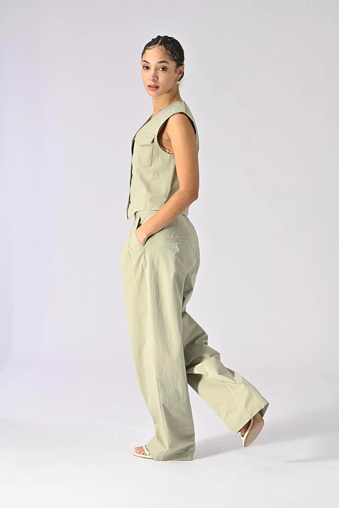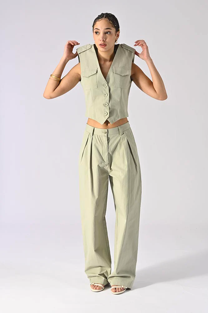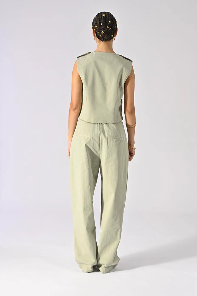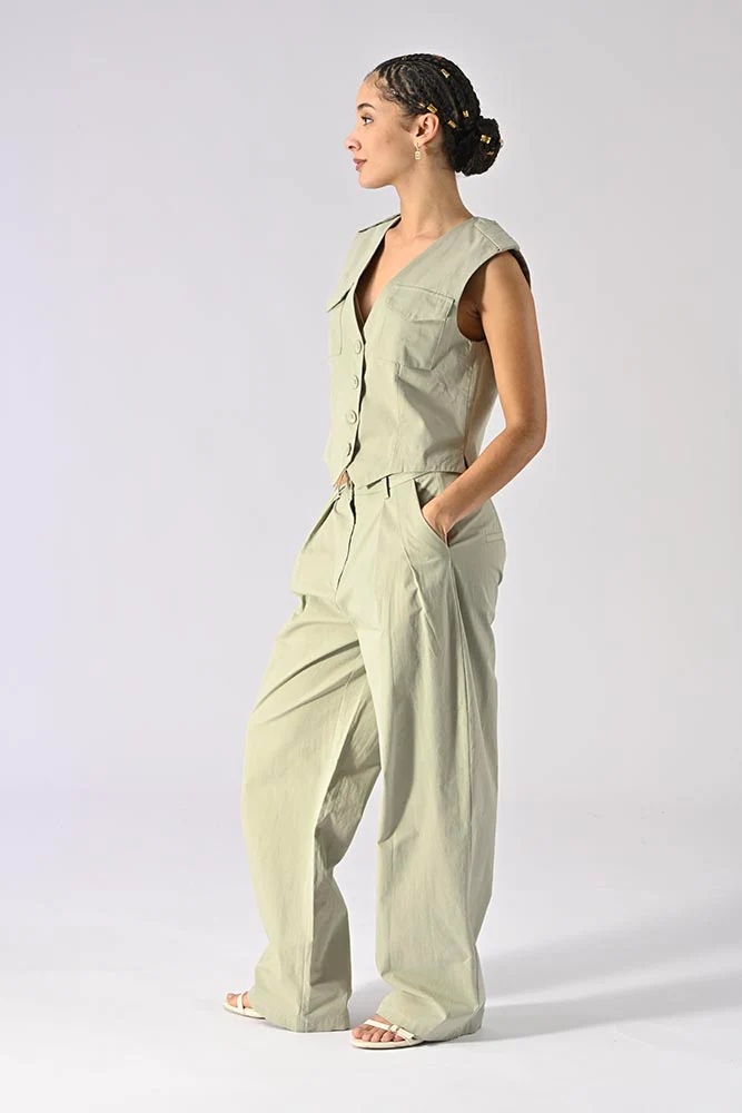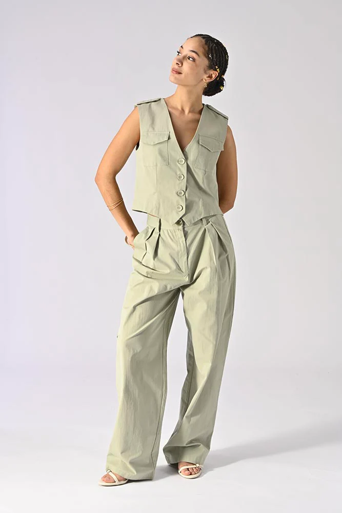 Conçu en 100% coton, ce gilet offre un confort optimal et une respirabilité adaptée aux saisons chaudes. La couleur vert tilleul, unie et apaisante, se marie facilement avec une large gamme de bas, des pantalons larges aux jupes légères.