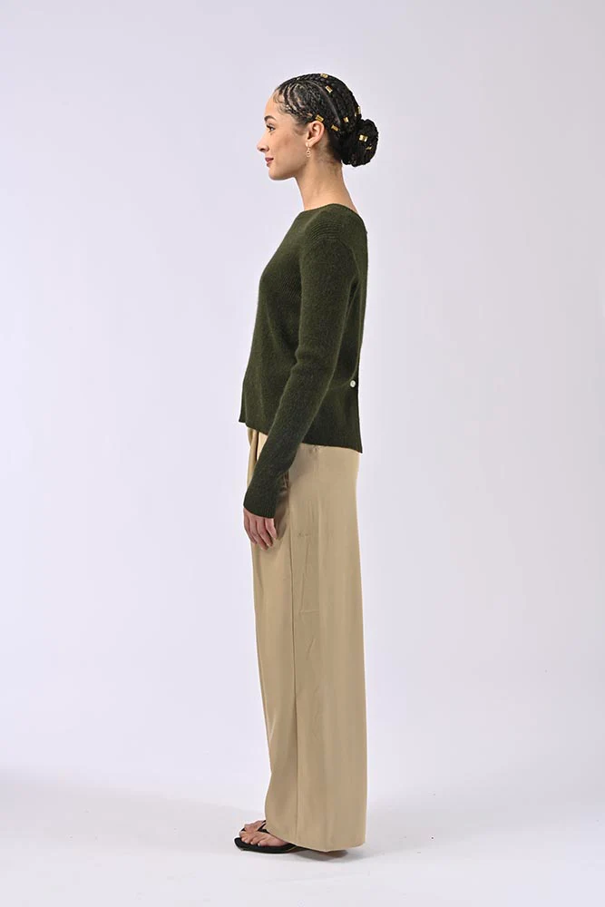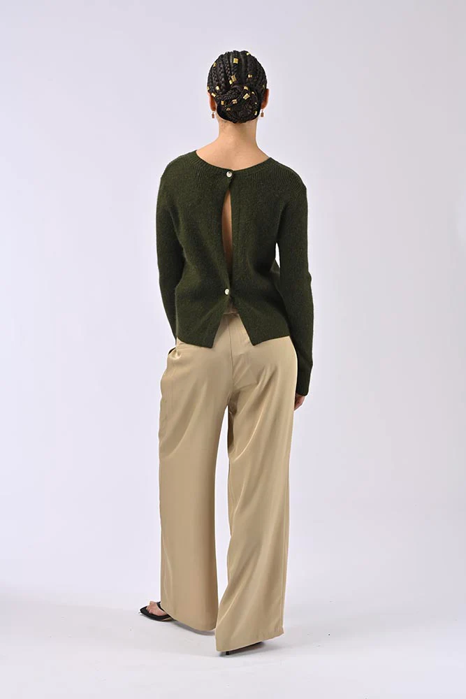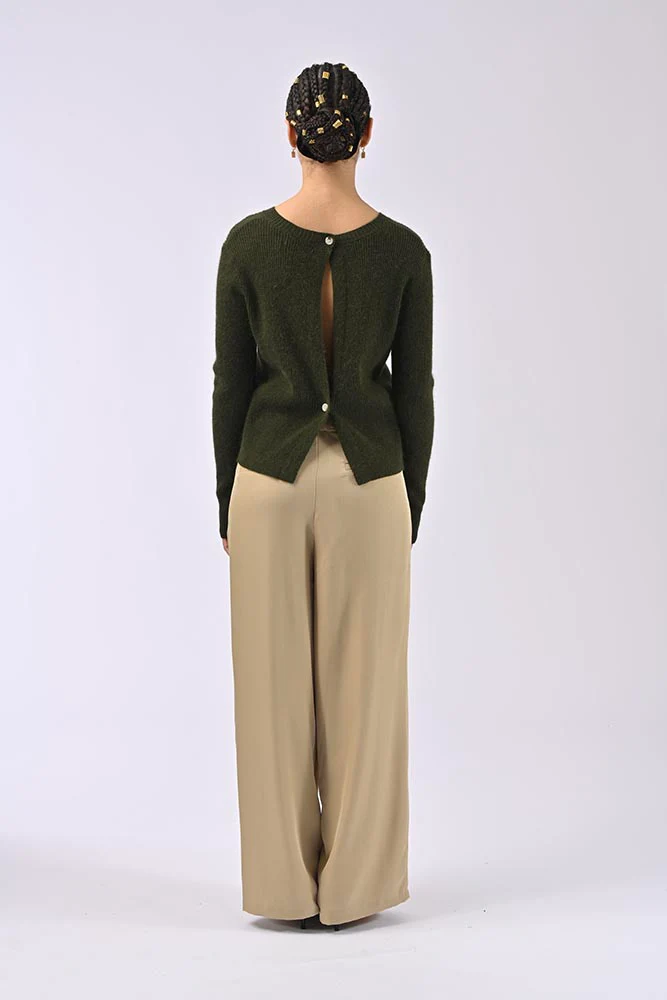 Les détails soignés incluent une ouverture à l’arrière fermée par des boutons, apportant une touche sophistiquée à ce vêtement décontracté. Associé à un pantalon ample ou un jean, ce gilet s’intègre parfaitement dans une garde-robe moderne et chic.