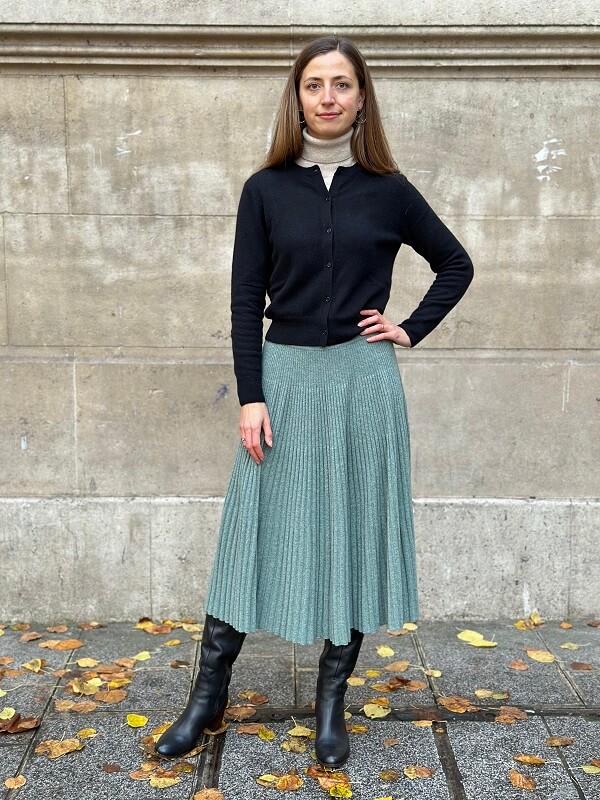 Jupe plissée longue grande taille originale hiver laine mérinos 100% vert céladon – Vanessa
