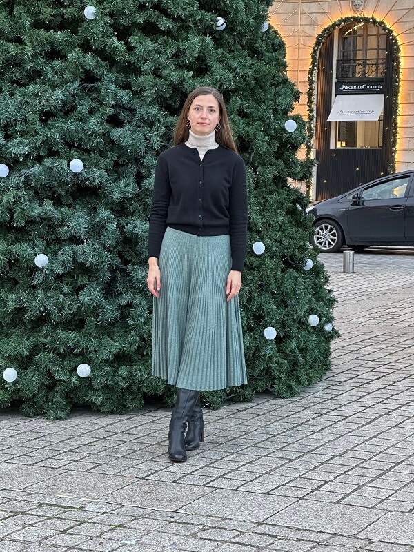 Coupe de la jupe : Une coupe évasée ou droite peut influencer la perception du volume créé par les plis. Une jupe ajustée à la taille est plus flatteuse.
