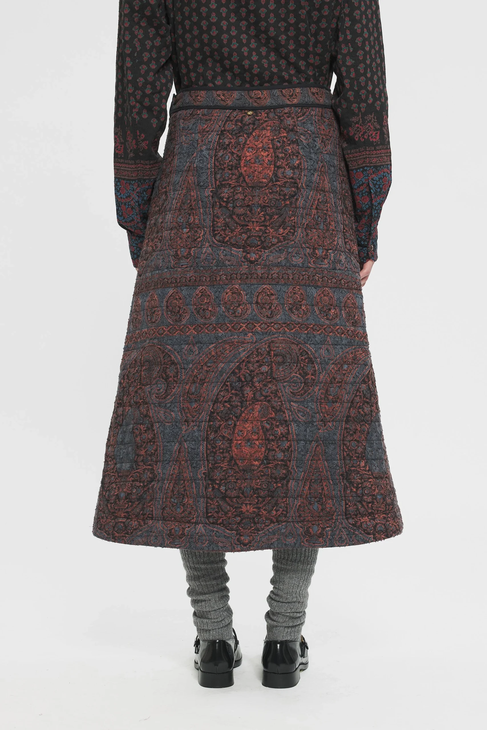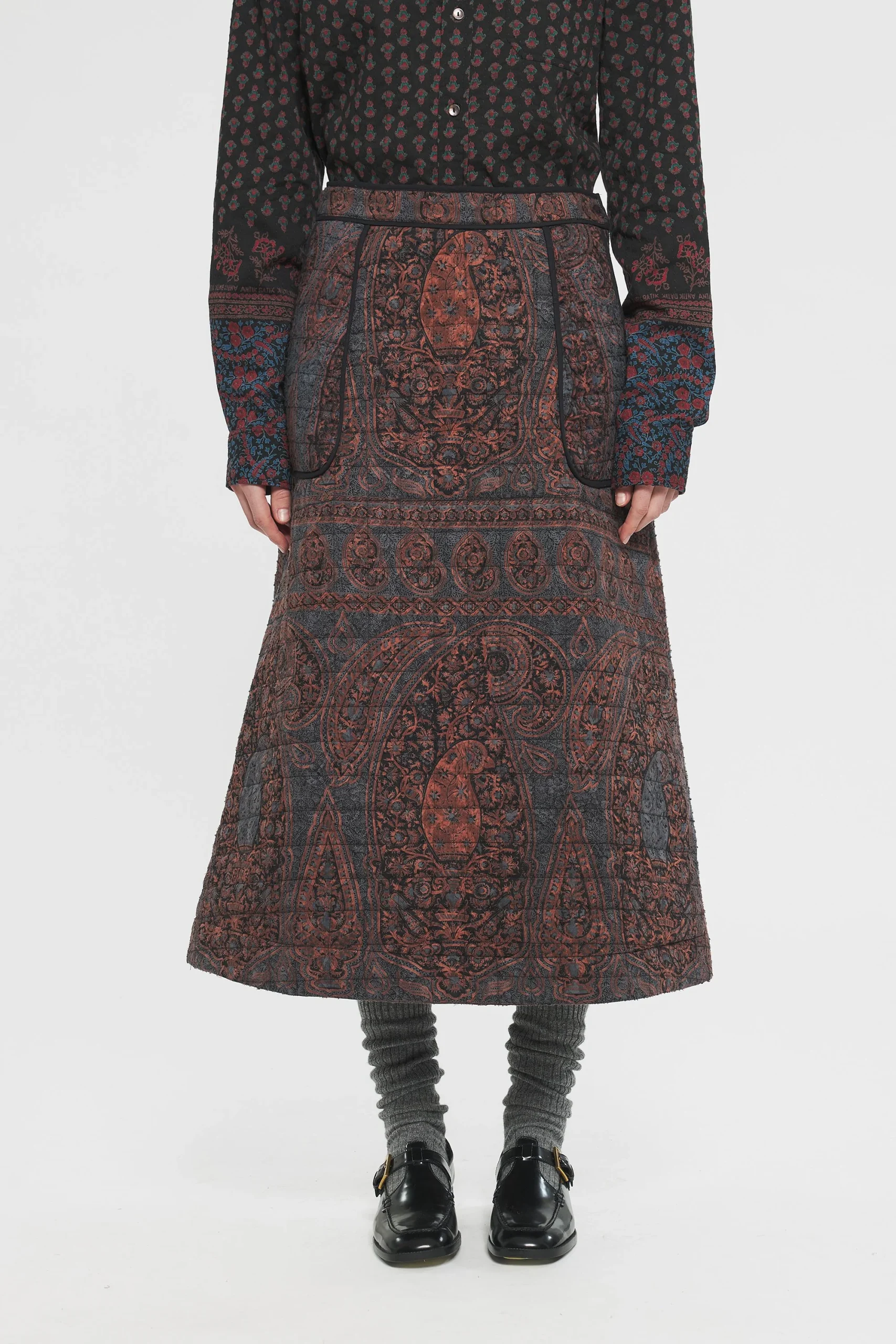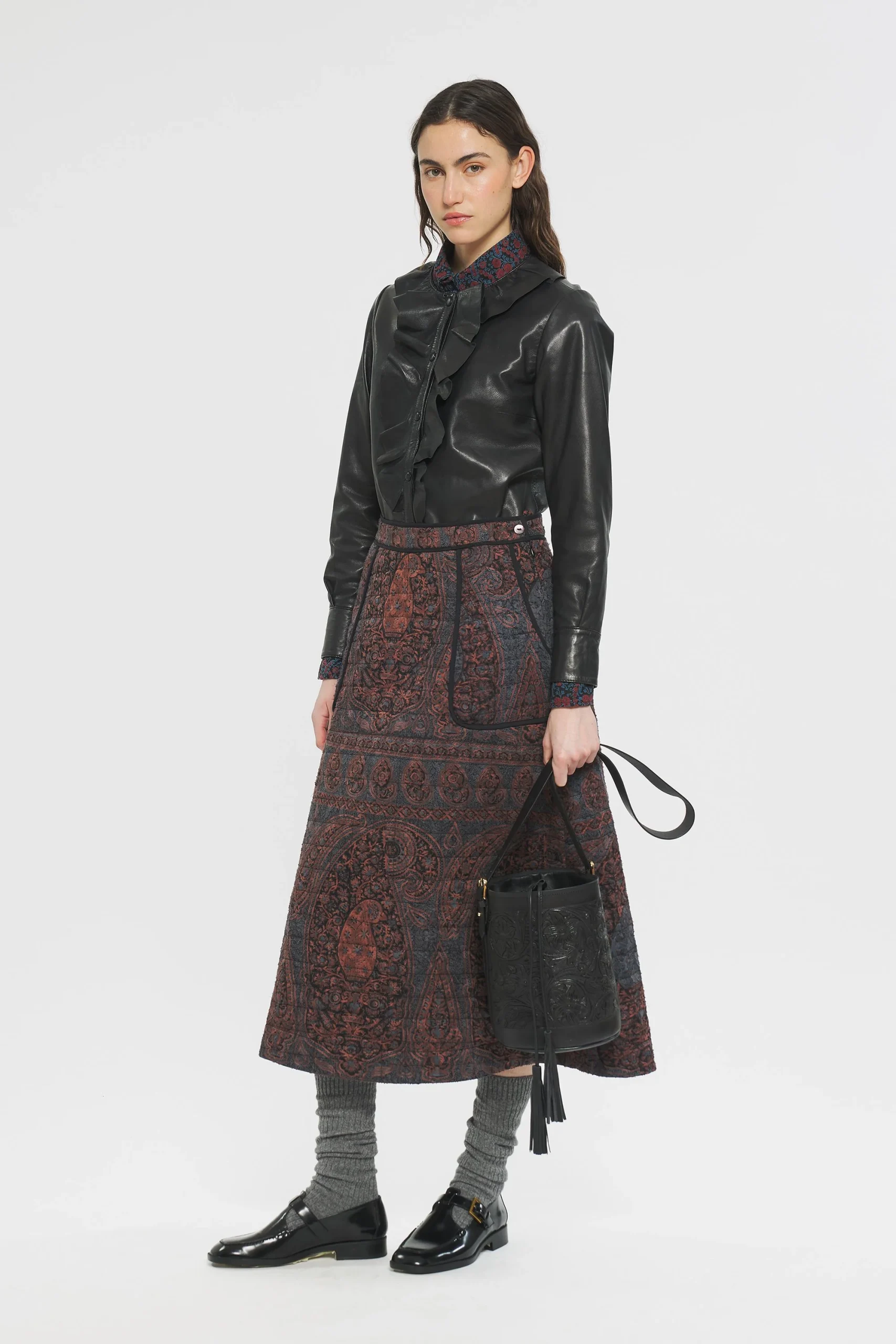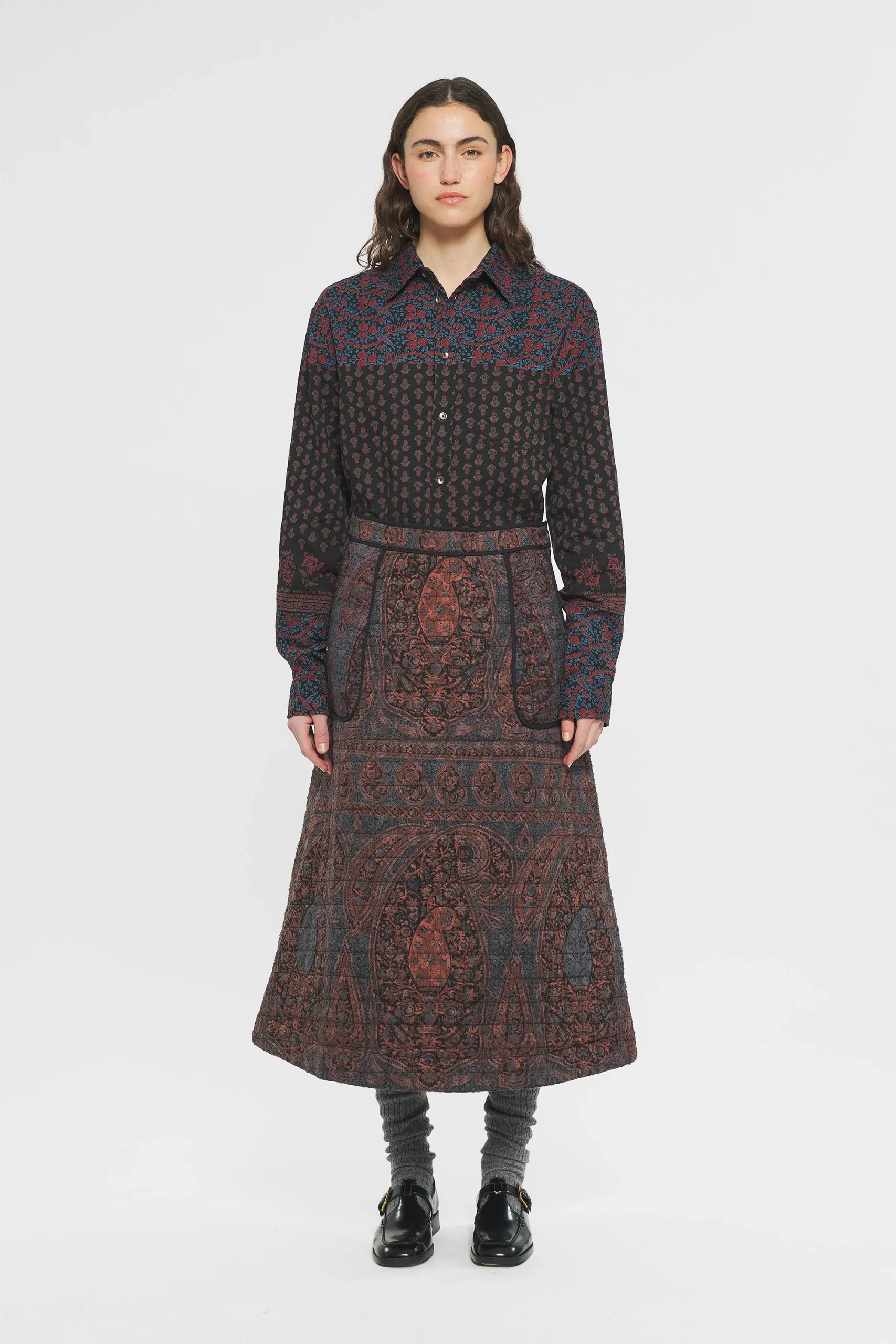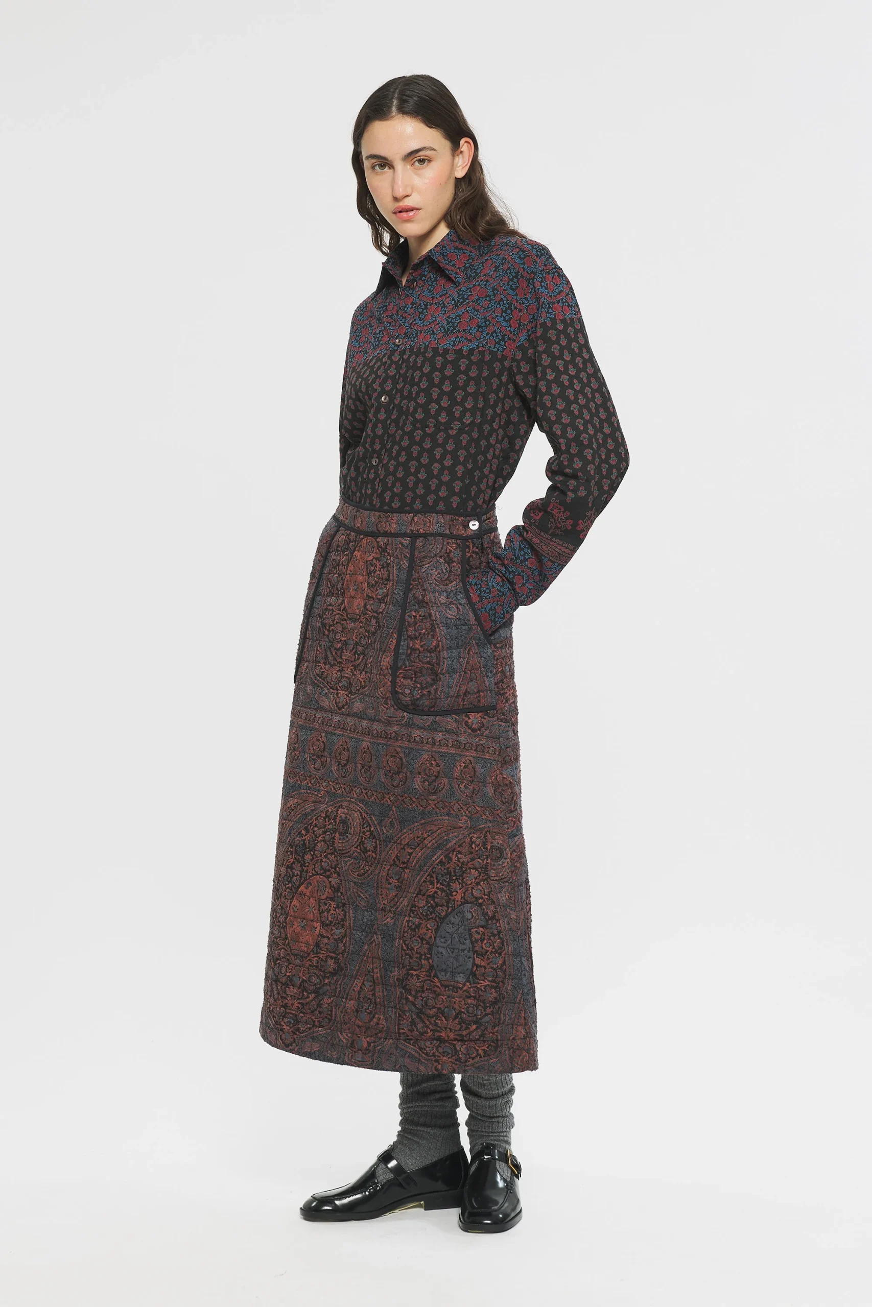 Jupe mi-longue en jacquard de coton imprimé avec surpiqûres. Imprimé dessiné dans notre atelier parisien puis appliqué à la main sur le tissu selon la technique du block print (savoir-faire artisanal indien). Deux poches latérales sur l’avant. Fermeture avec un zip et un bouton sur le côté gauche. Bouton de nacre naturelle. Doublure en coton à imprimé contrasté.