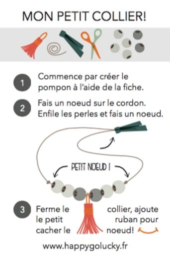 Le Kit Crée ton collier pompon est le petit cadeau à offrir sans modération ! Dans une jolie boite berlingot, vous trouverez tout le nécessaire pour réaliser un joli collier avec un cordon élastique doré français, de belles perles argentées européennes, des perles en bois de hêtre du Jura et un petit ruban en Liberty pour habiller le nœud en toute discrétion. Il y a aussi un morceau de feutrine 100% pur laine vierge pour apprendre à faire un joli pompon.