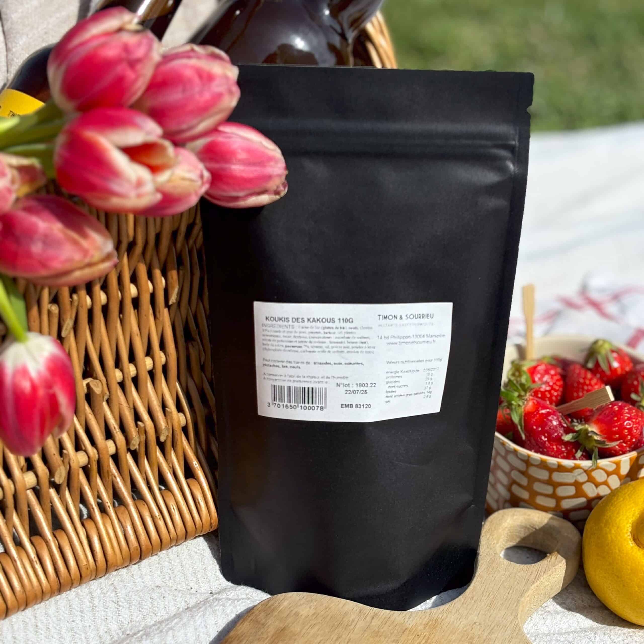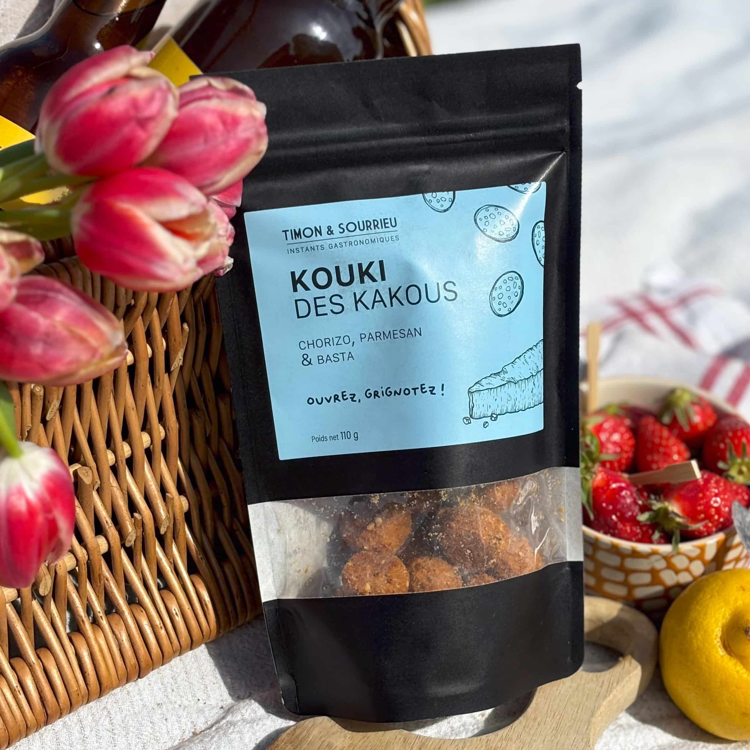 Kouki des kakous de Timon&Sourrieu – 110g Cookies salés d’apéritif au goût de Chorizo et de Parmesan.