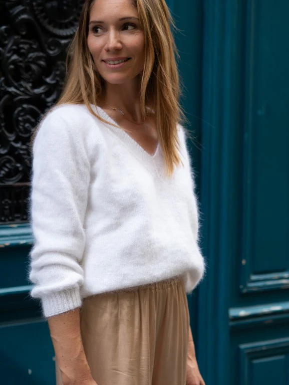 Il est tricoté dans une laine haut-de-gamme, mélange d’angora et de mérinos. Il est tout en finesse et en raffinement.