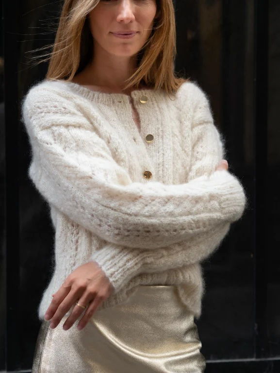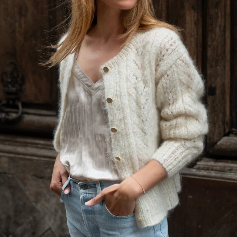 Notre gilet Lucie en 100% mohair est parfait pour passer l’hiver au chaud avec style.
