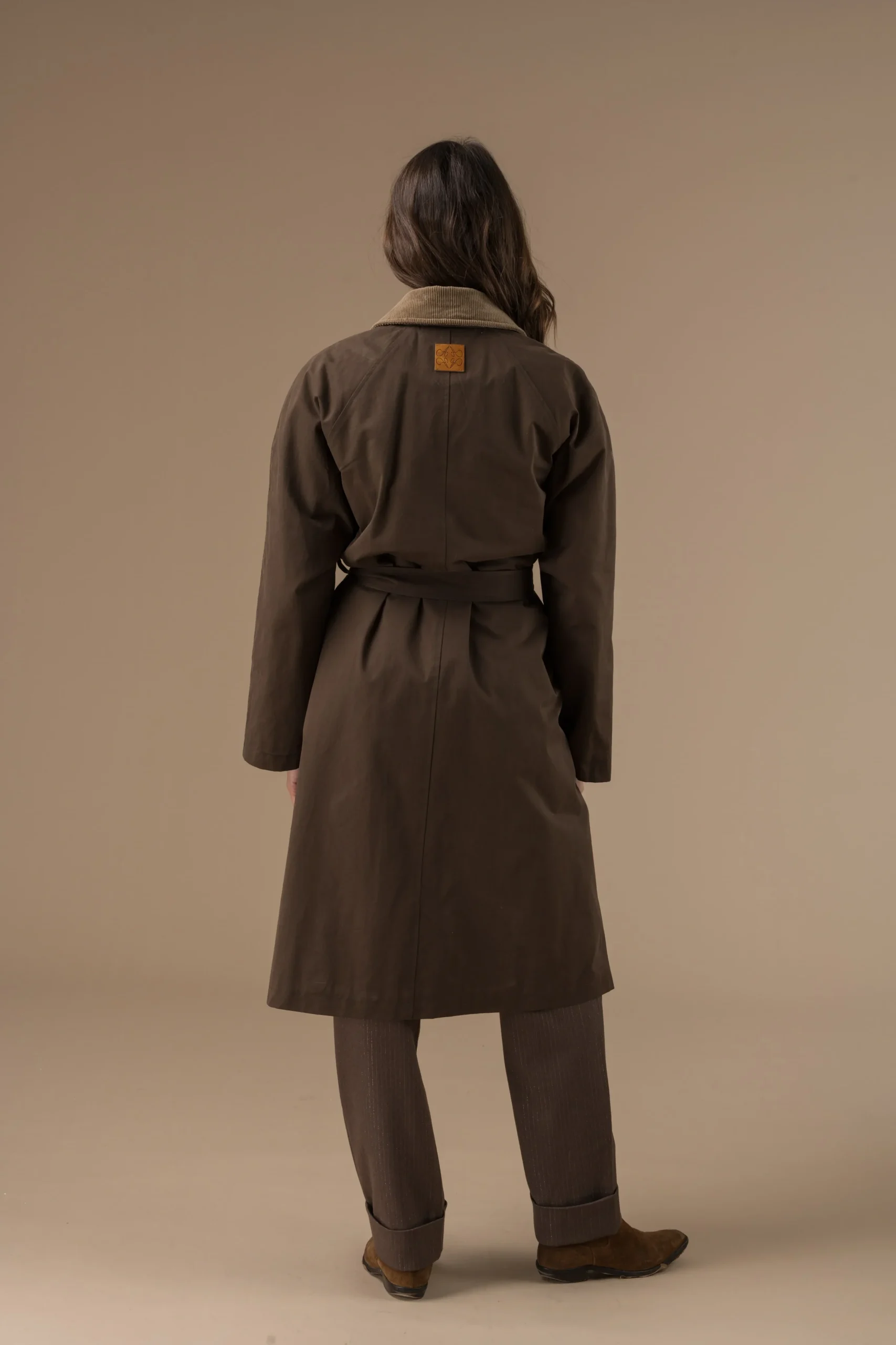 Manteau chocolat en coton col contrasté et ceinture au dos