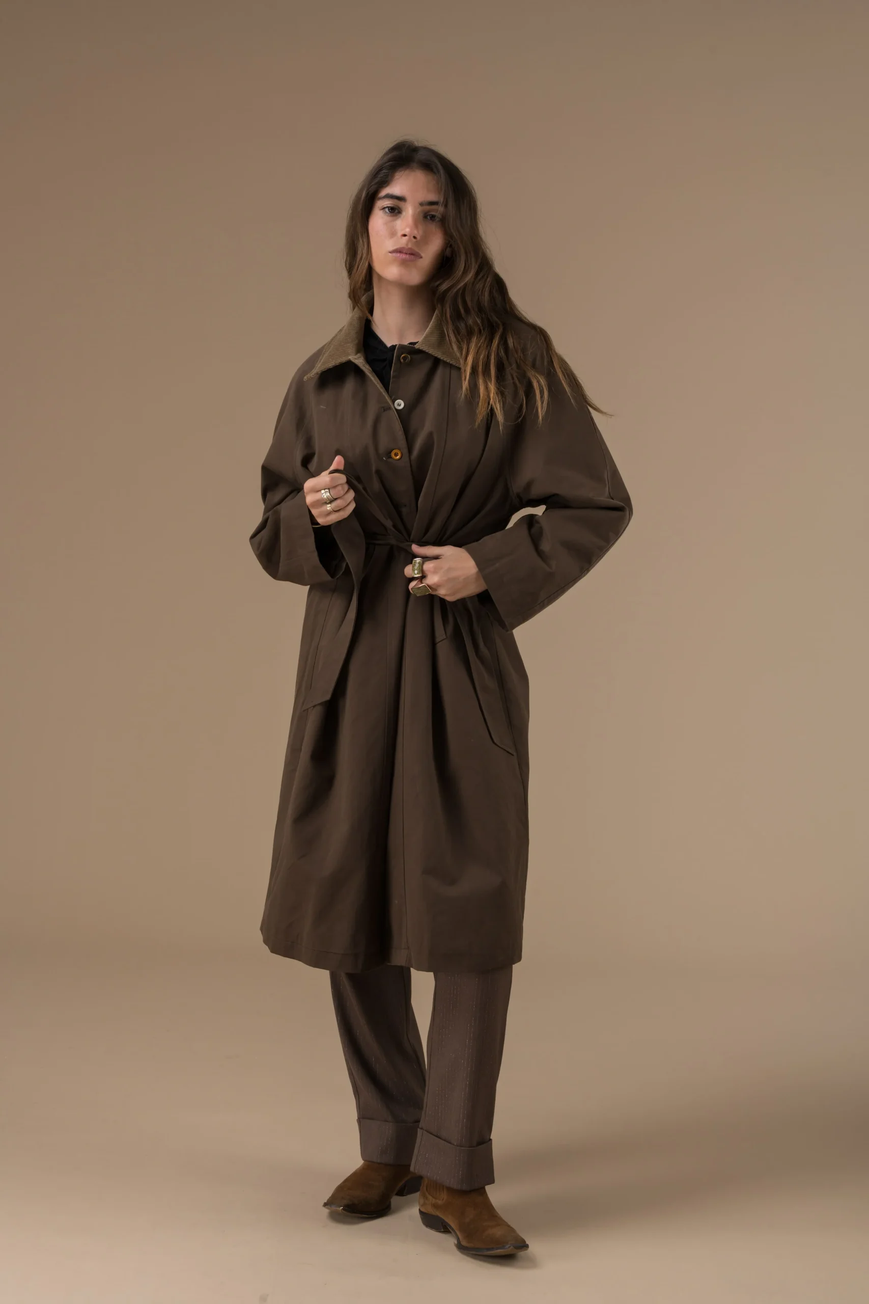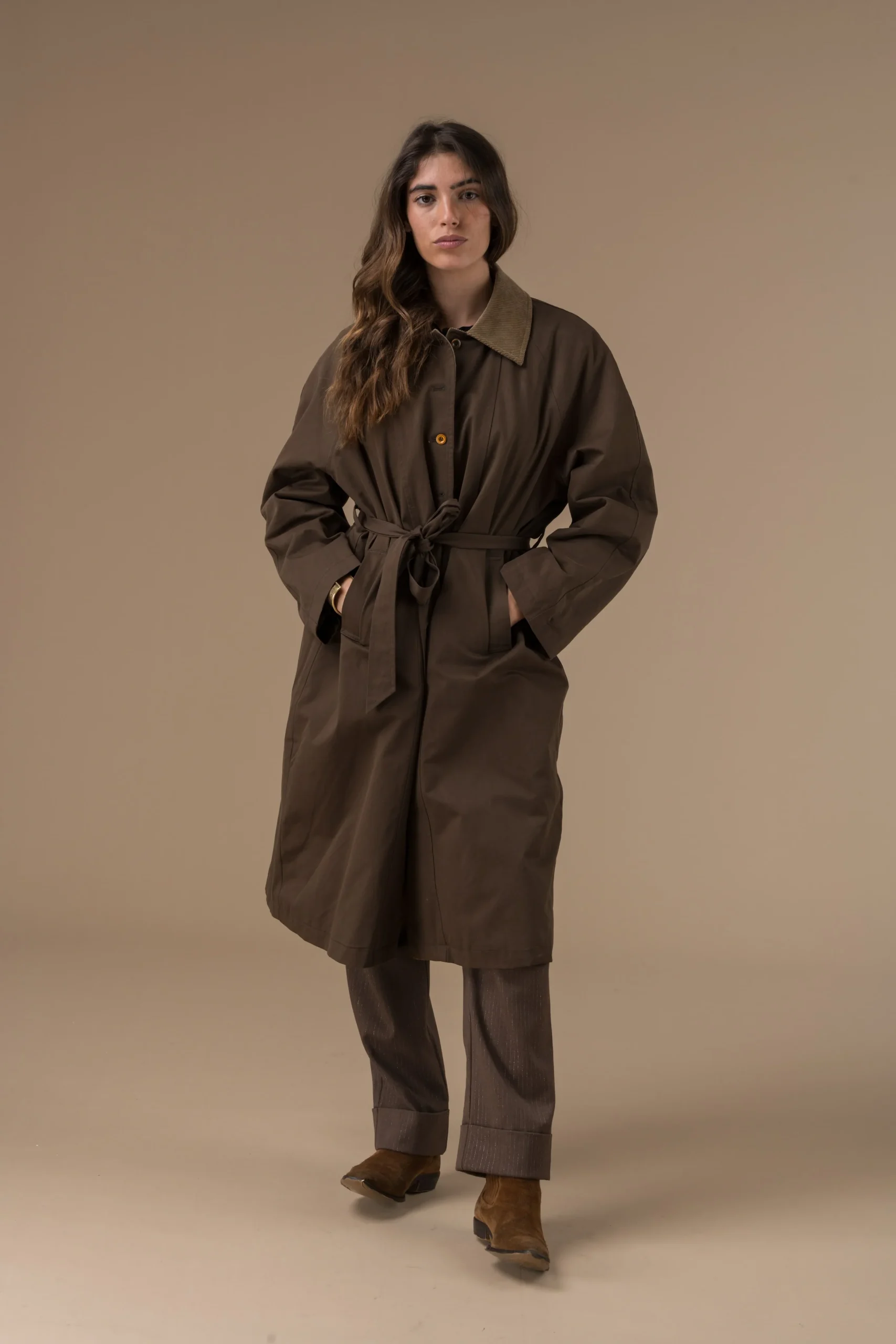 Manteau chocolat en coton col contrasté et ceinture au dos. Élégant, à la coupe ample et facile à porter au quotidien.