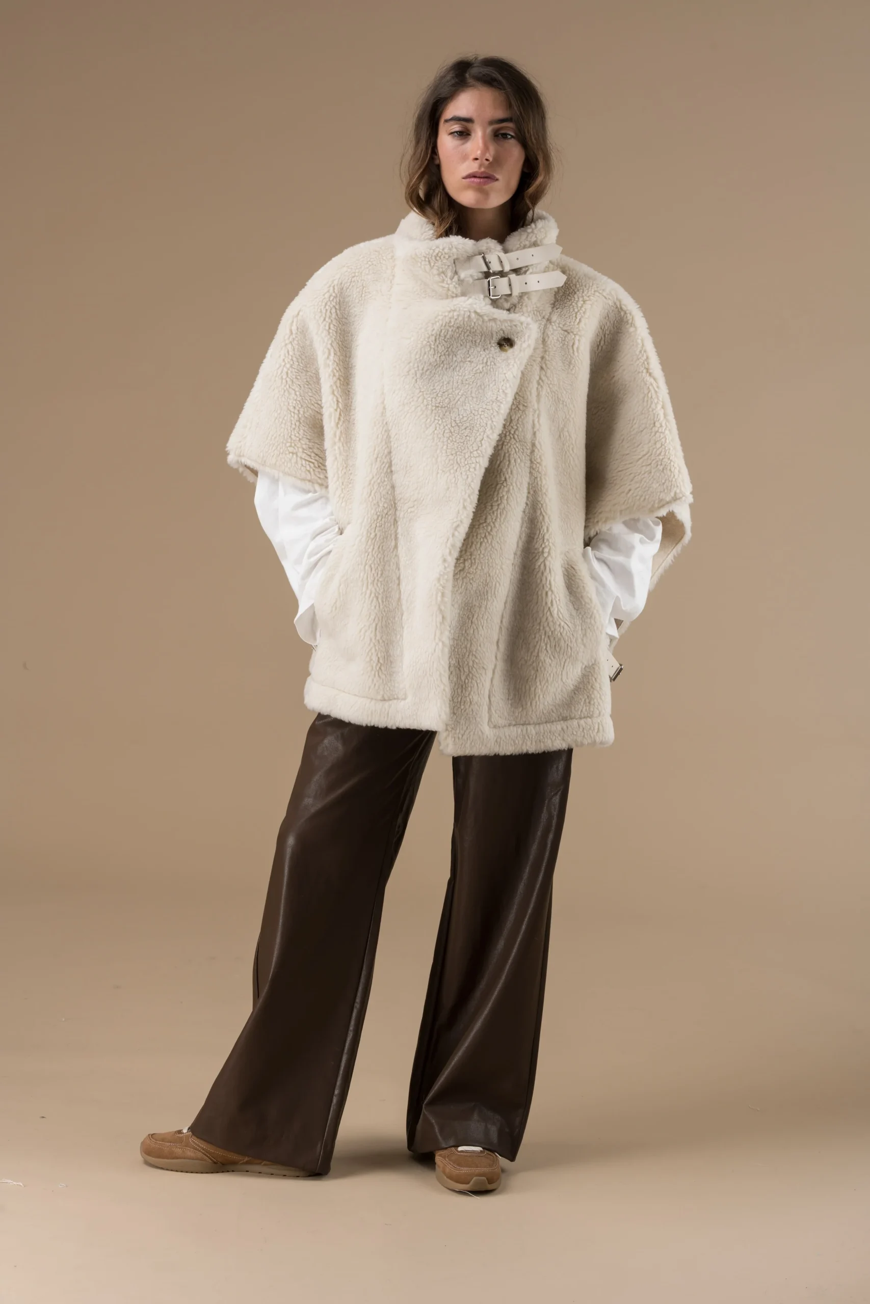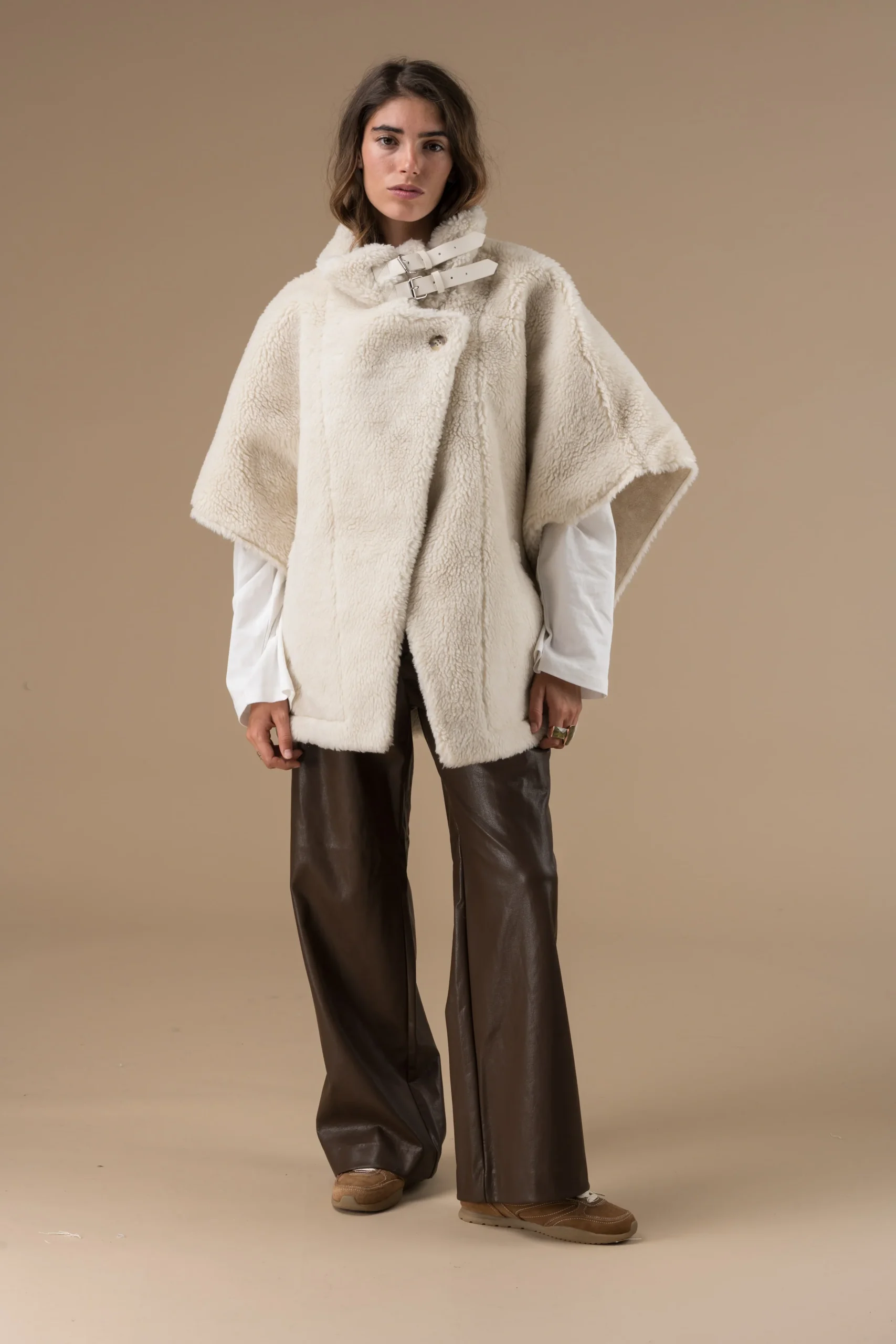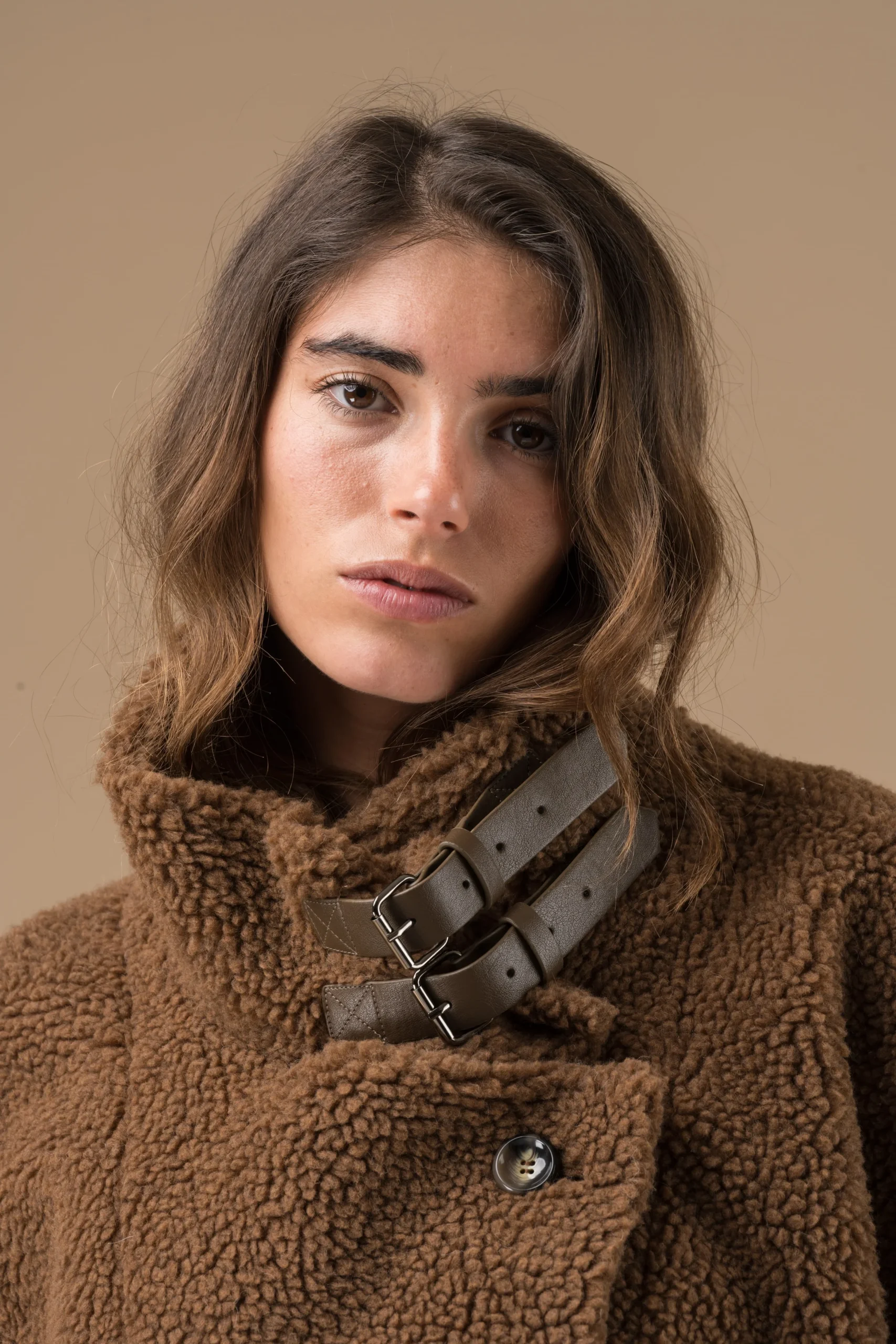Manteau Olga fausse fourrure en mouton retourné. Avec sa matière fausse fourrure façon mouton retourné et ses détails boucles contrastées, le manteau Olga combine chaleur et style. Sa coupe oversize, facile à porter, en fait la pièce cosy idéale pour l’hiver.