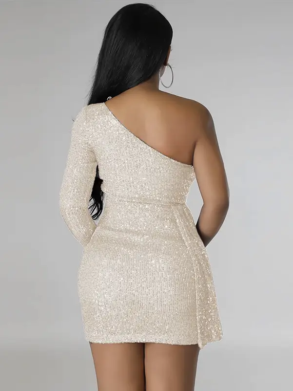 Une élégance discrète qui mettra en valeur vos meilleurs atouts. Notre mini robe de soirée asymétrique sequins dorés drapée est très féminine avec son encolure asymétrique une manche longue et son drapé audacieux. Mettez en valeur votre silhouette en forme de sablier grâce à sa coupe bodycon sculptante.