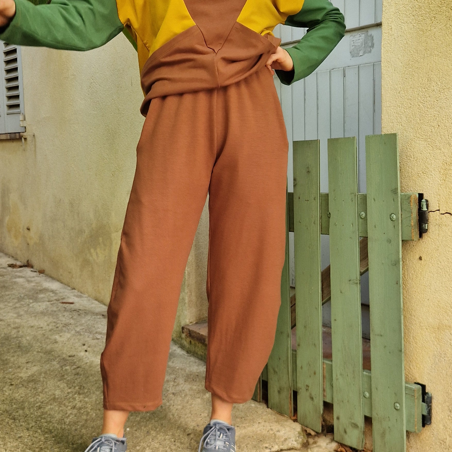 Pantalon pour femme en sweat, tissu au choix. Le pantalon est plutôt ample, de forme carotte et de longueur 7/8e, avec des poches. Longueur +/- 90cm. Vous pouvez choisir entre une ceinture élastique ou une ceinture yoga. Je fais 165cm et porte le pantalon en sweat Tiramisu, en taille 36, ceinture yoga.