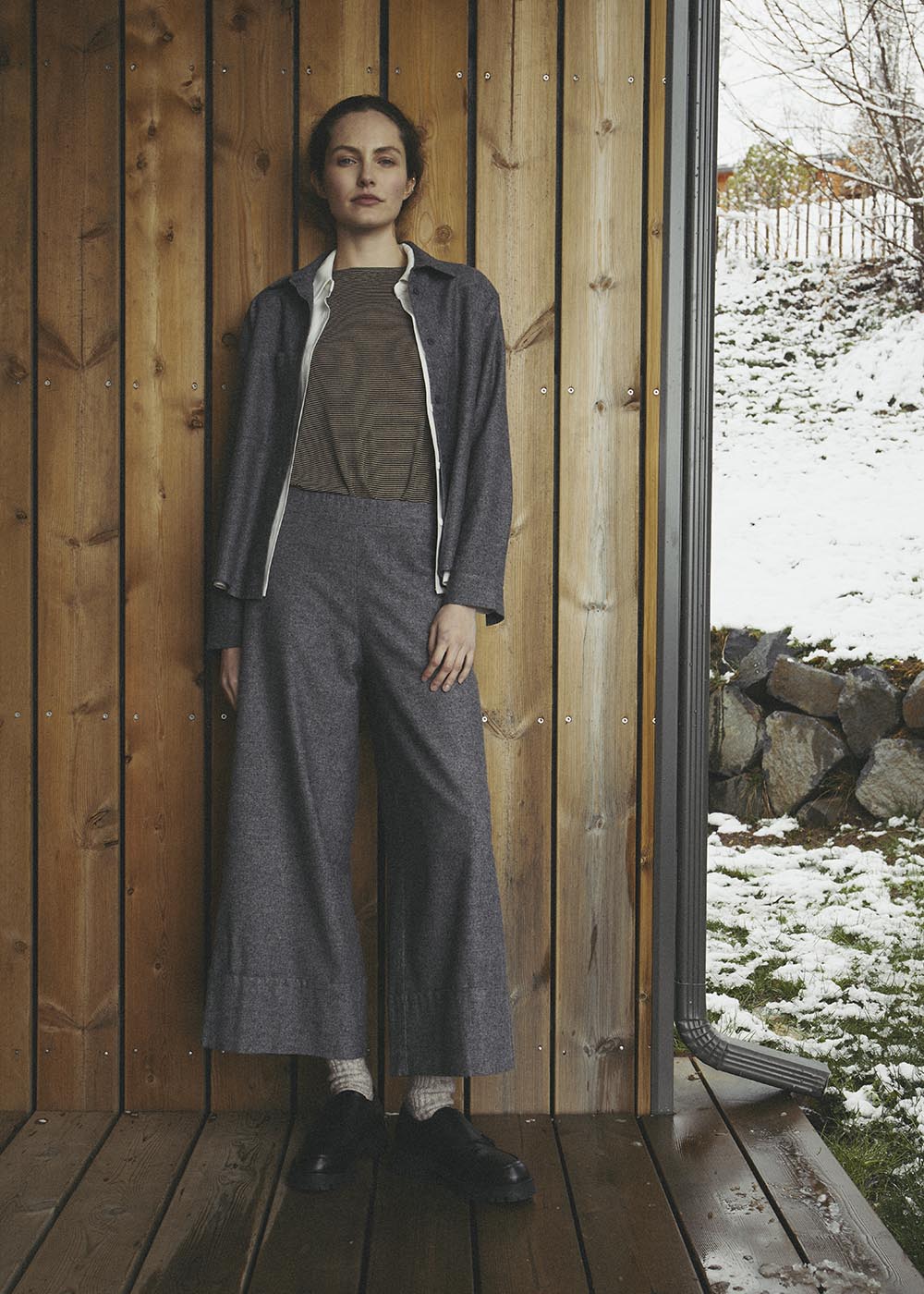 – Pantalon large à grand revers en flanelle chinée