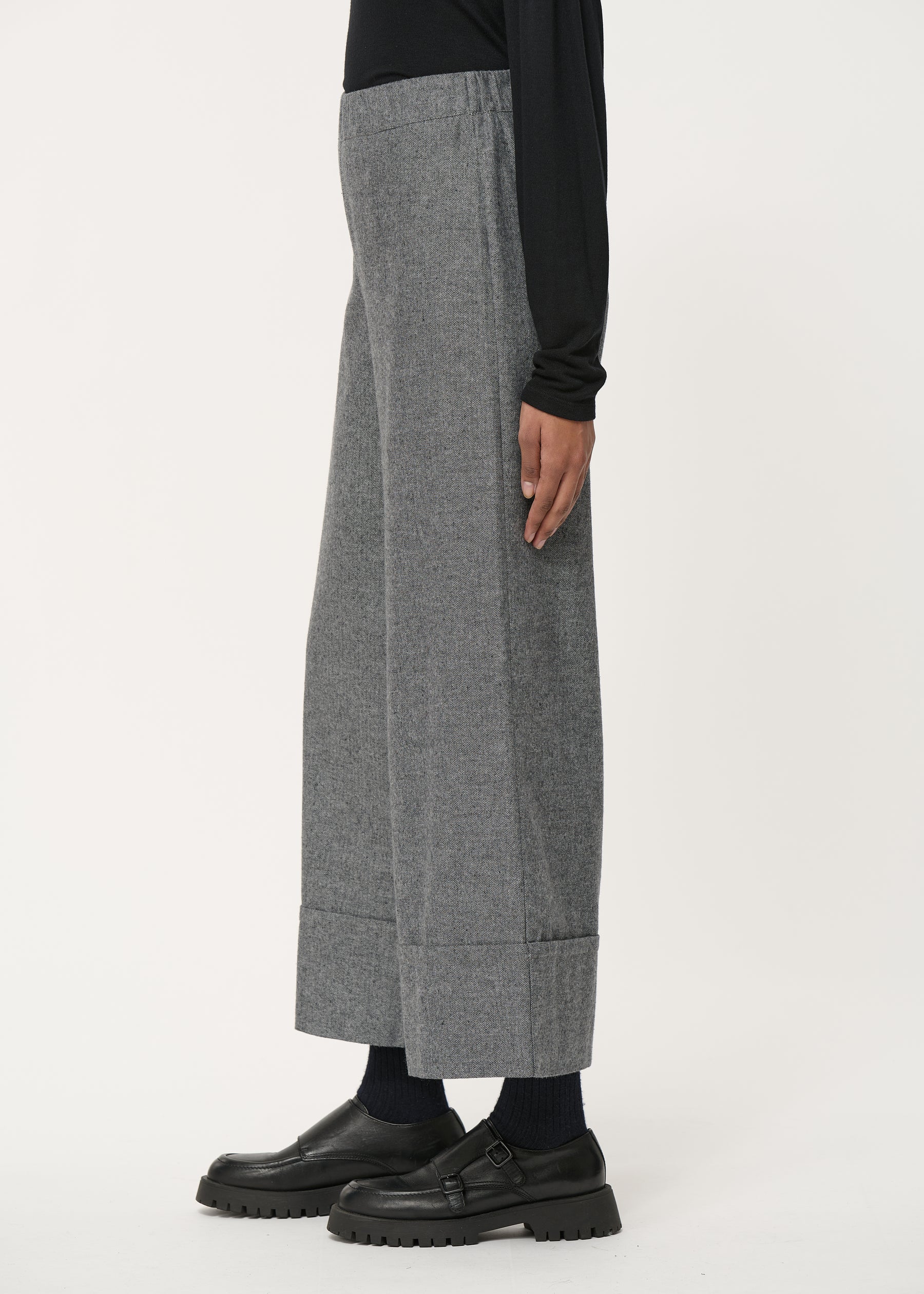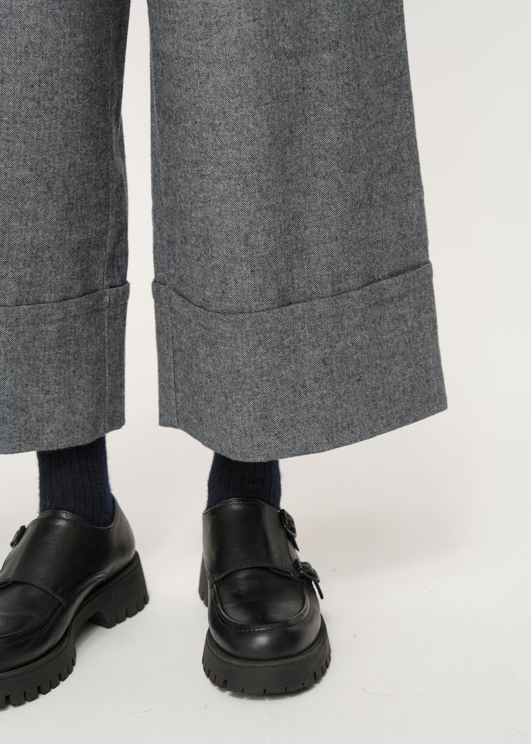 Pantalon large gris foncé à grand revers en flanelle chinée