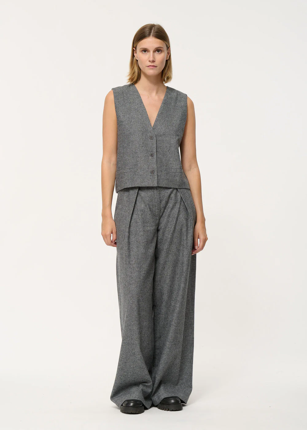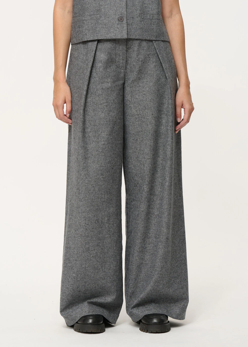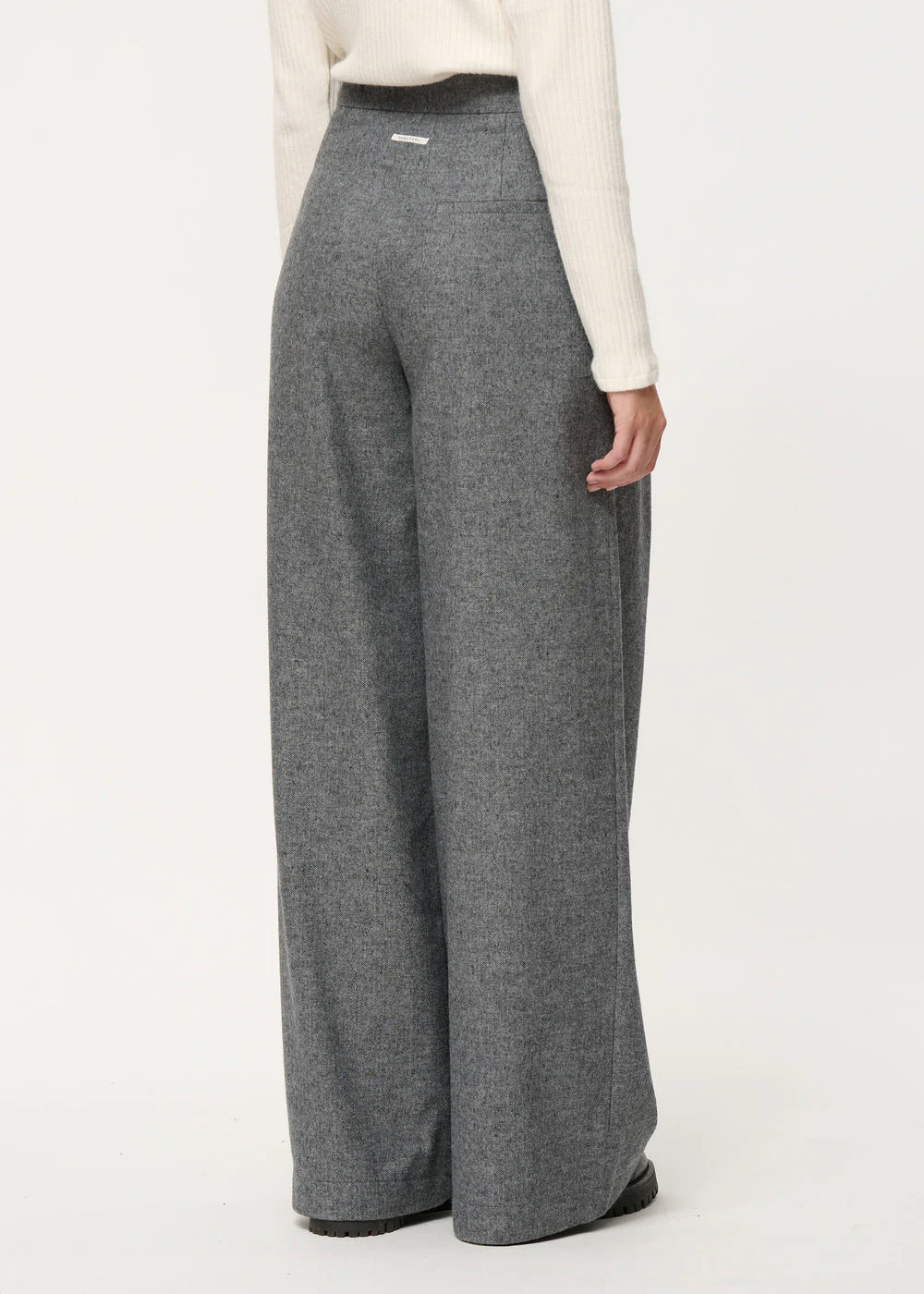 – Pantalon large en flanelle chinée– Deux plis rabattus boutonnés à la taille– Taille haute– Fermeture par un crochet et braguette zippée– Poches invisibles dans les coutures côtés Notre mannequin mesure 1m73 et porte une taille 36/S.Ce modèle se porte ample, prenez une taille en-dessous de votre taille habituelle pour un porté plus ajusté.