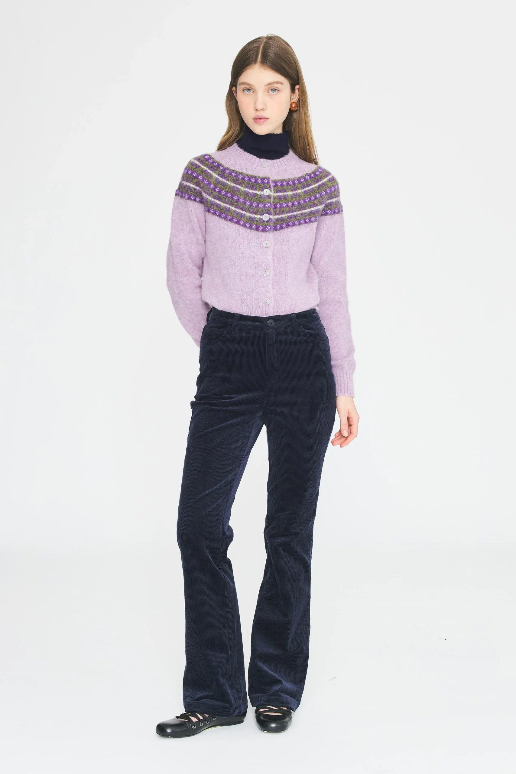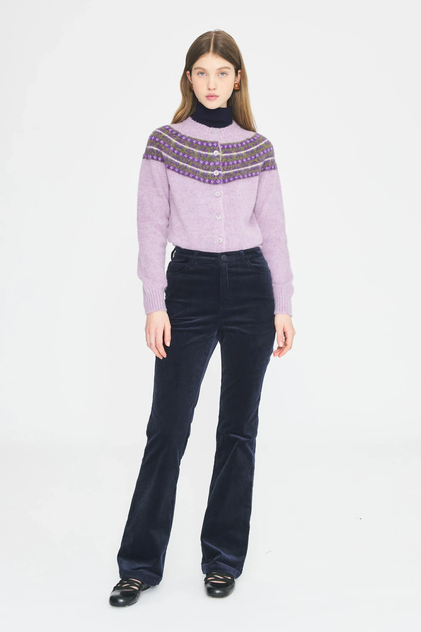Pantalon flare en coton velours côtelé évasé aux chevilles. Fermeture avec un bouton et un zip sur le devant. Deux poches sur le devant et à l’arrière du pantalon. Passants pour ceinture.