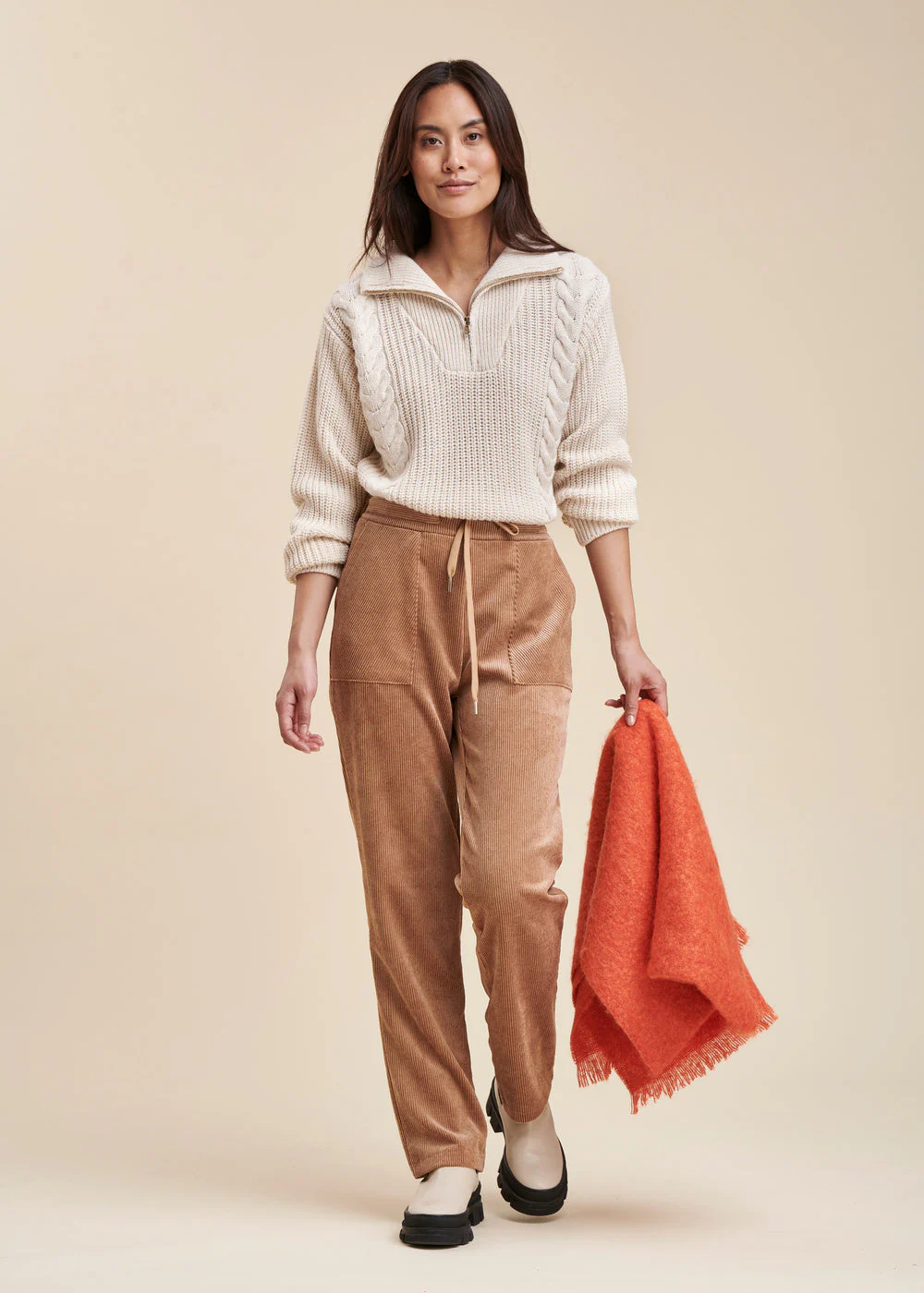 Pantalon en velours souple, coupe carotte, ceinture avec coulisse et lien de serrage, poches plaquées sur le devant et une petite poche passepoilée dans le dos.