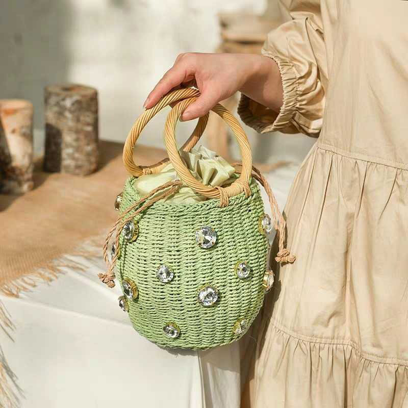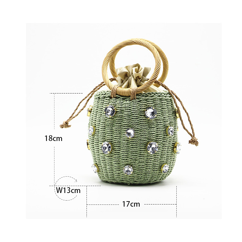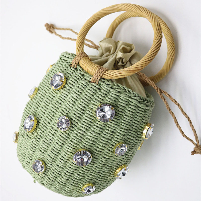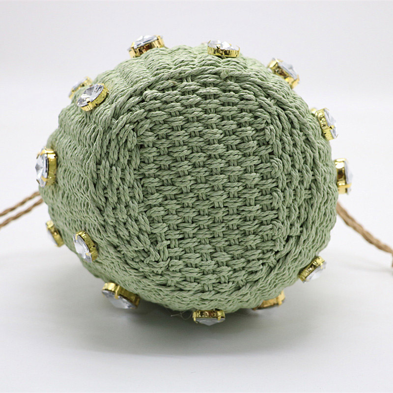 Petit Sac Paille Seau Vert Orné de Cristaux