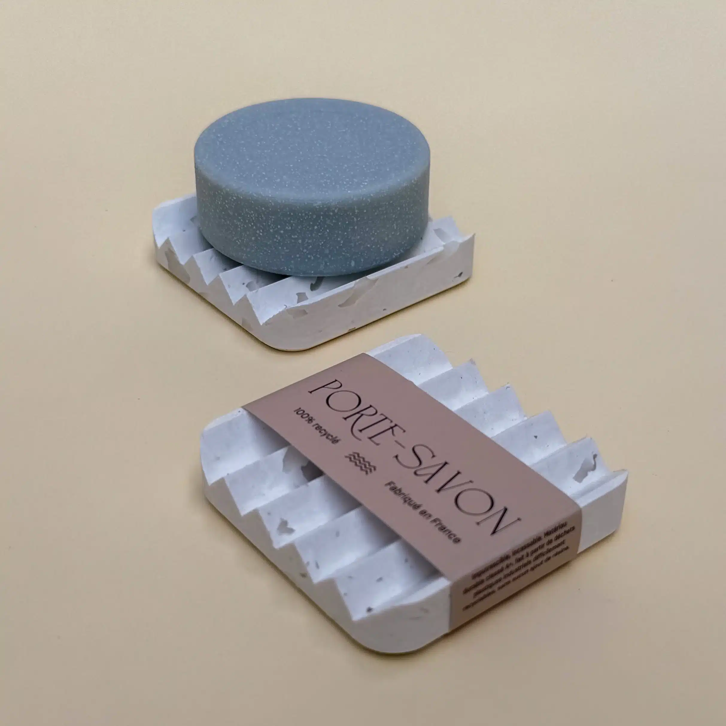 Fabriqués artisanalement en France à partir de déchets plastiques entièrement revalorisés, ces porte-savons arborent un effet marbre terrazzo moderne et épuré. Grâce à leur design intelligent, vos cosmétiques solides bénéficient d’un séchage rapide et optimal, garantissant leur longévité.