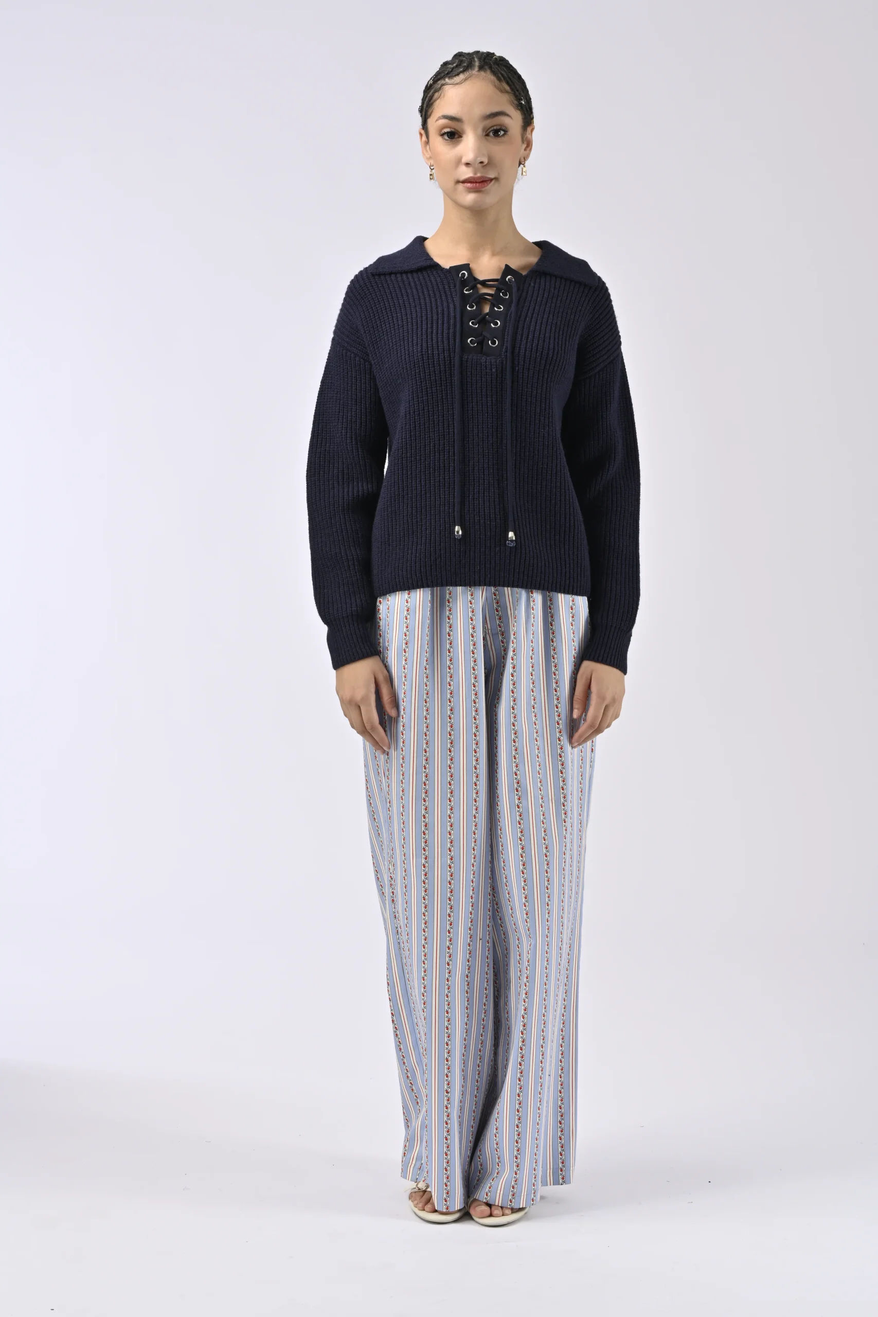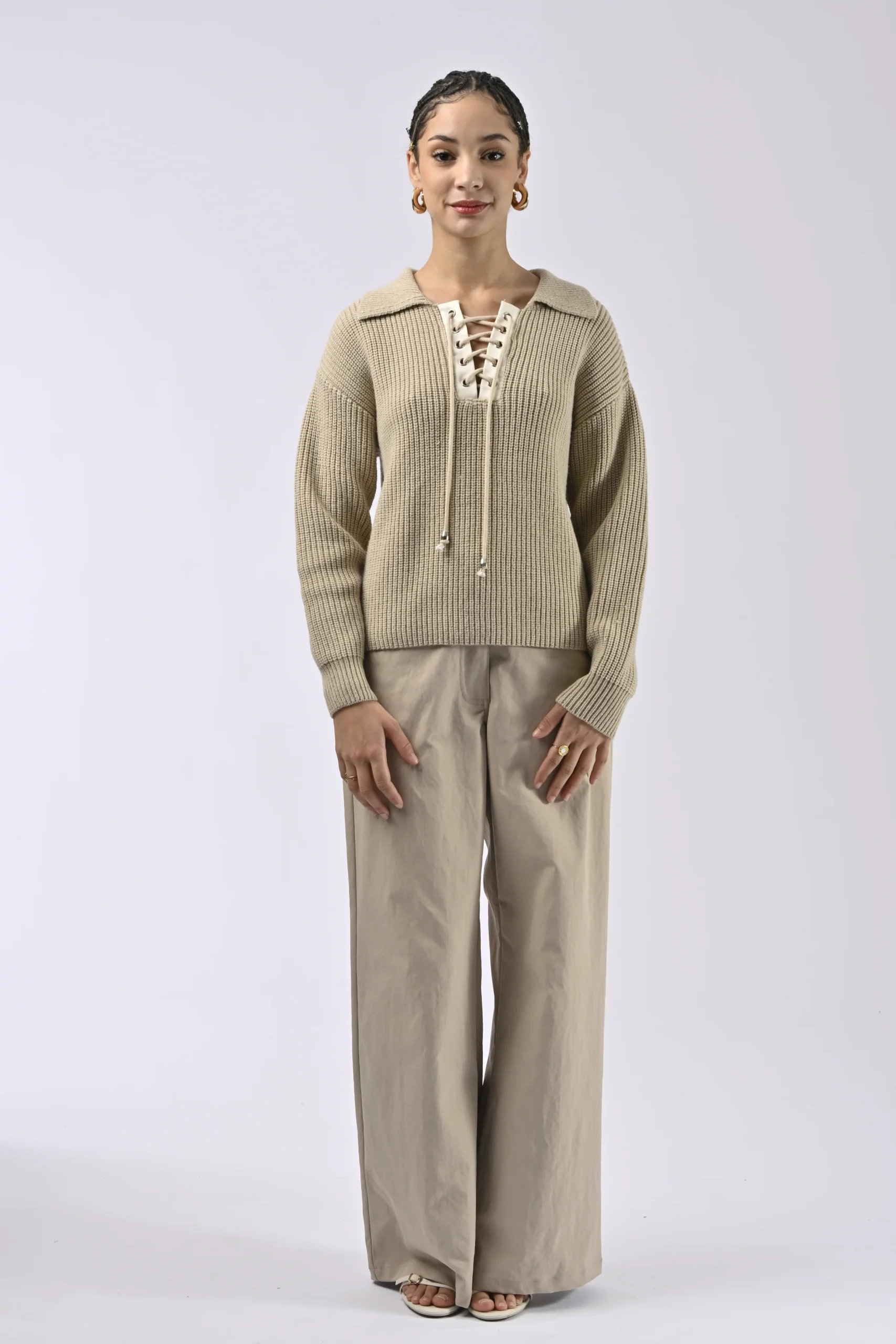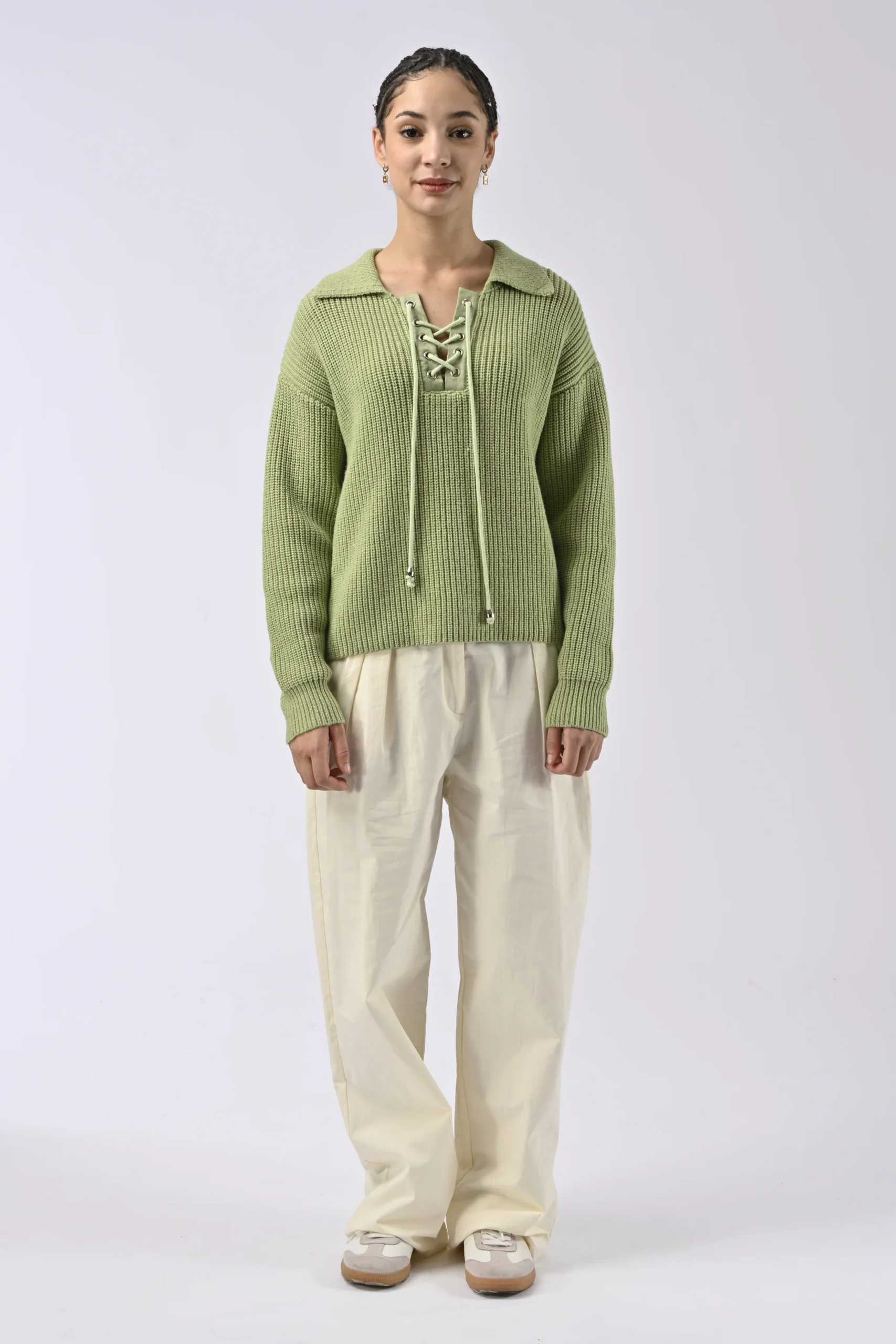 Pull en maille. Col v. Manches longues. Coupe droite. Détails lacet sur le décolleté. Couleur écru. La photographie de la couleur Ecru n’est plus disponible.