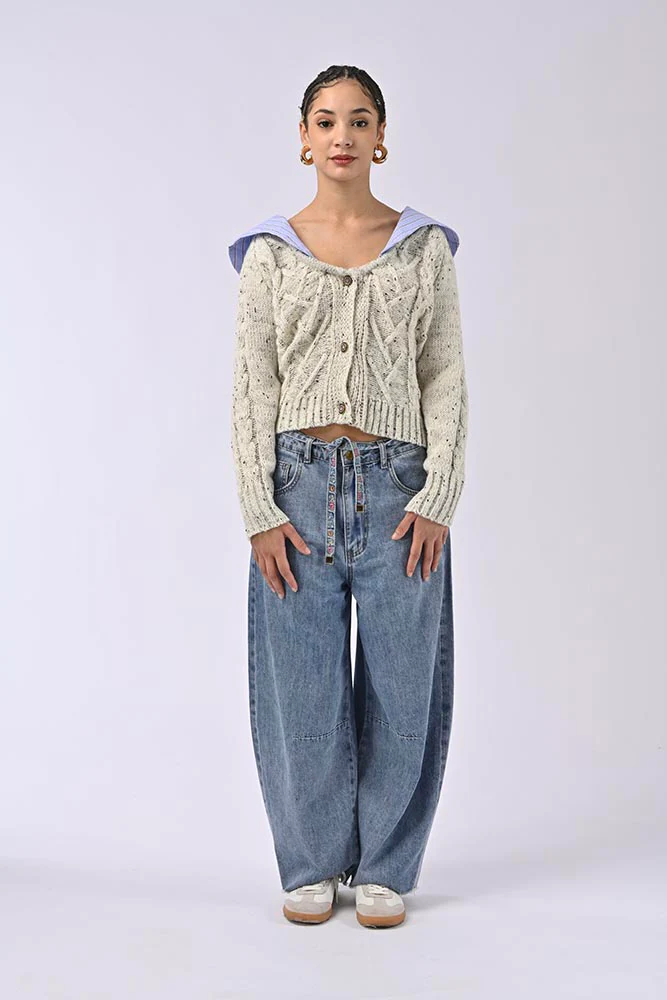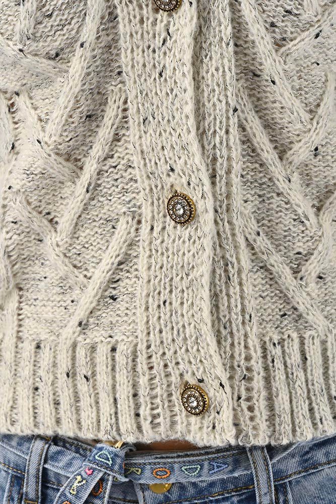 Le modèle présente une texture tricotée avec des motifs en relief et des torsades, lui conférant du caractère. Les boutons décoratifs sur le devant renforcent son style sophistiqué, tandis que sa coupe légèrement ample assure un port confortable.