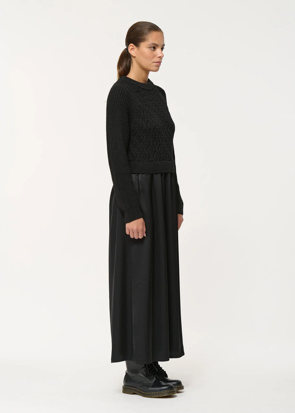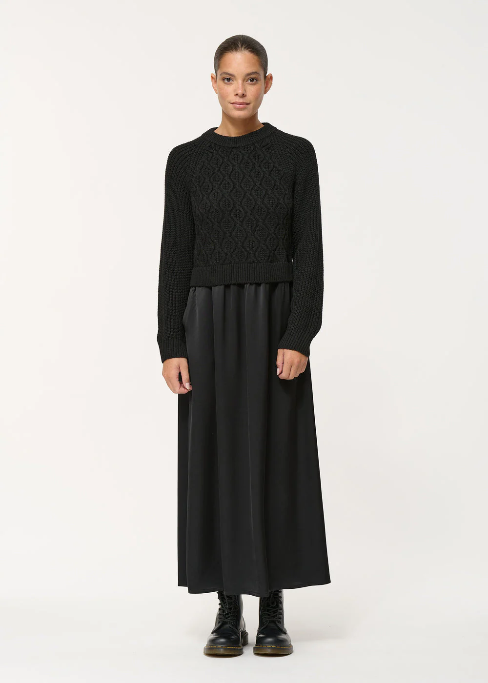 – Robe ample longue bi-matière à torsades graphiques– Haut en tricot, bas en satin de viscose souple– Encolure ras-du-cou– Manches longues, emmanchures raglan– Poches italiennes– Longueur : 131 cm Notre mannequin mesure 1m72 et porte une taille 36/S.Ce modèle se porte ample, prenez une taille en-dessous de votre taille habituelle pour un porté plus ajusté.