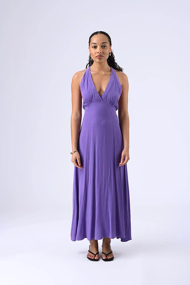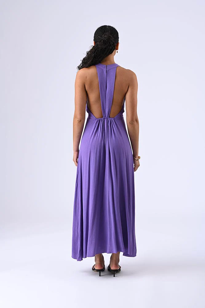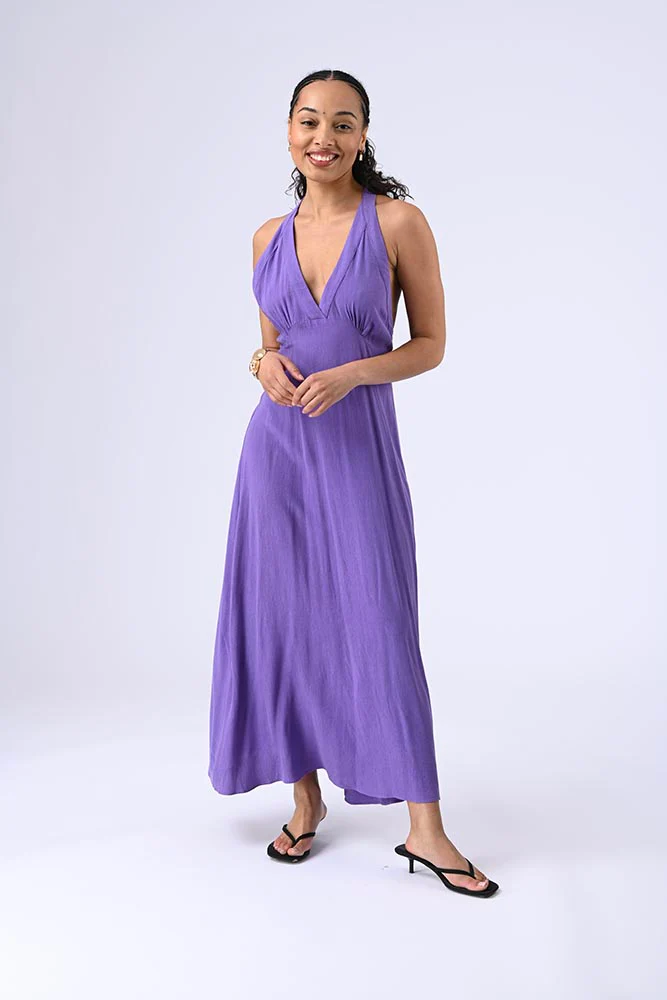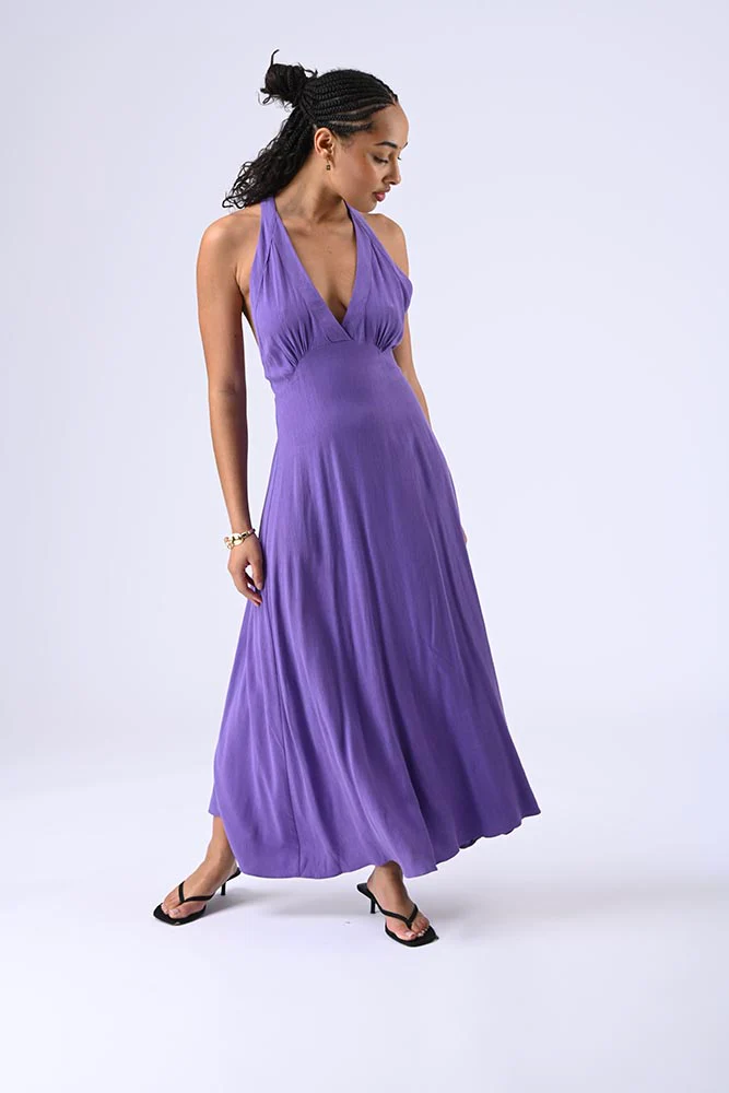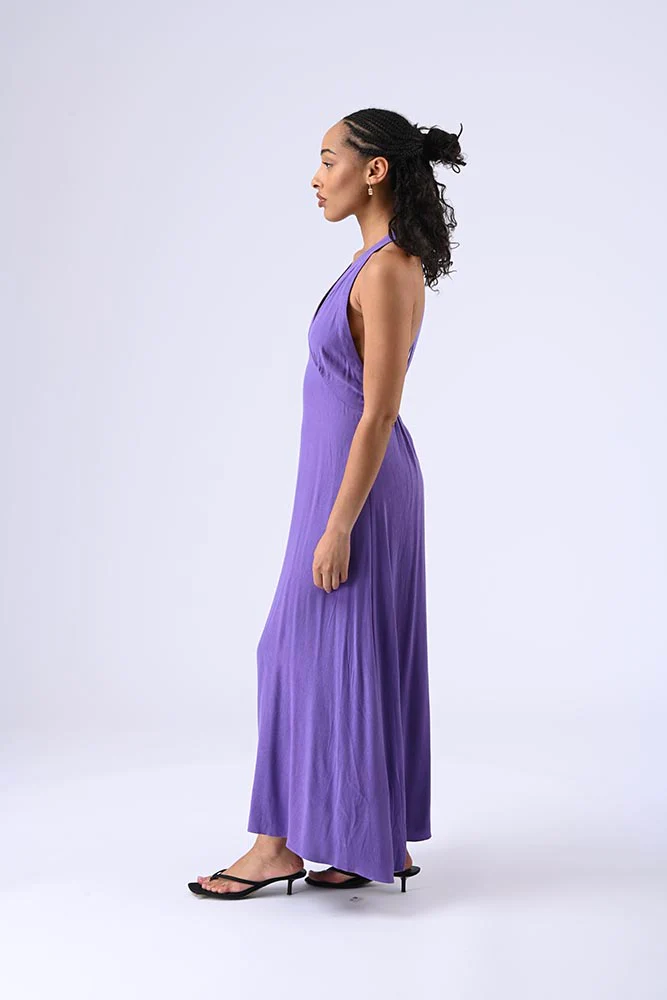 Robe longue à décolleté plongeant, dos nu avec larges bretelles reliant le bas, élastique sur le haut pour un ajustement parfait et une allure audacieuse. Couleur violet