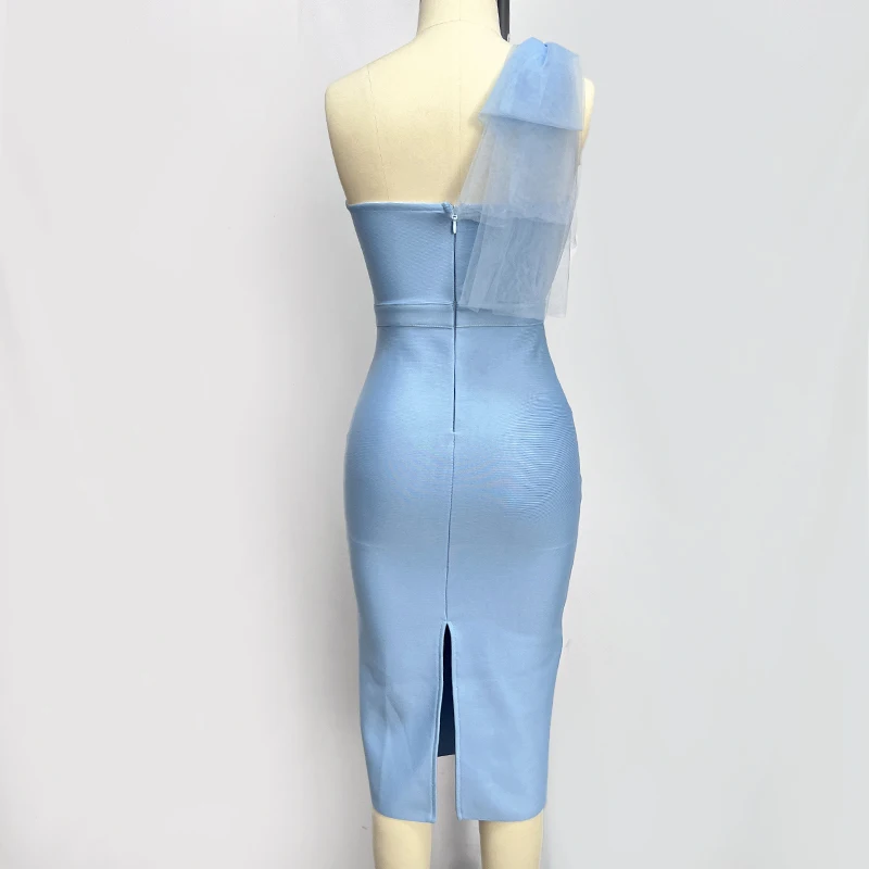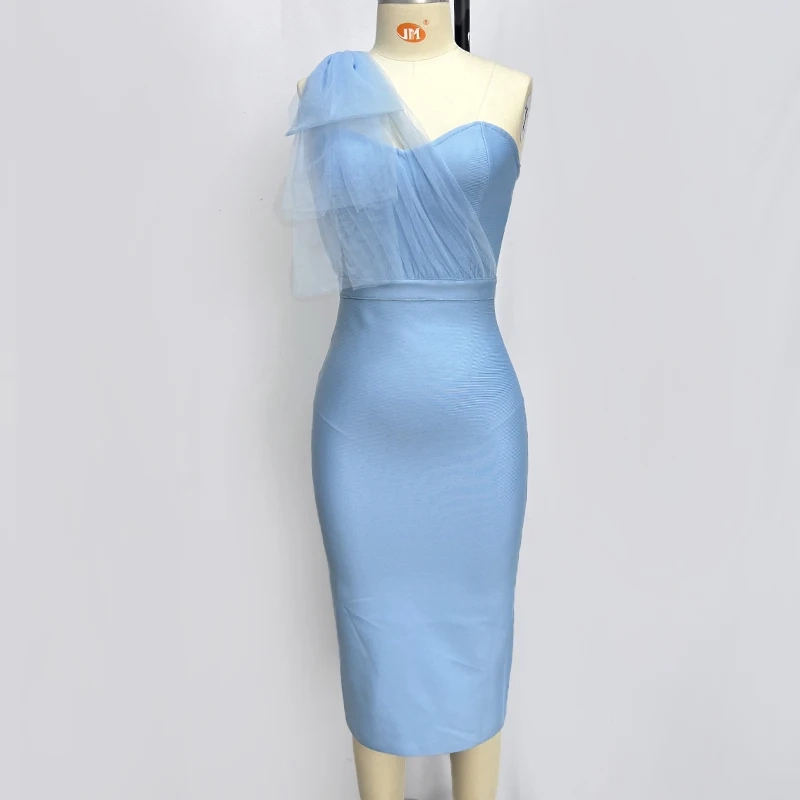 Un bleu pastel doux et lumineux, pour une allure empreinte de sérénité. Cette robe bandage midi est une pièce d’un romantisme absolu. Sa coupe asymétrique est sublimée par un spectaculaire nœud en tulle sur l’épaule, qui ajoute un volume aérien et une touche « couture ». Le bustier sweetheart est délicatement voilé par le tulle, tandis que le tissu bandage signature sculpte le reste du corps pour une silhouette de sirène impeccable.
