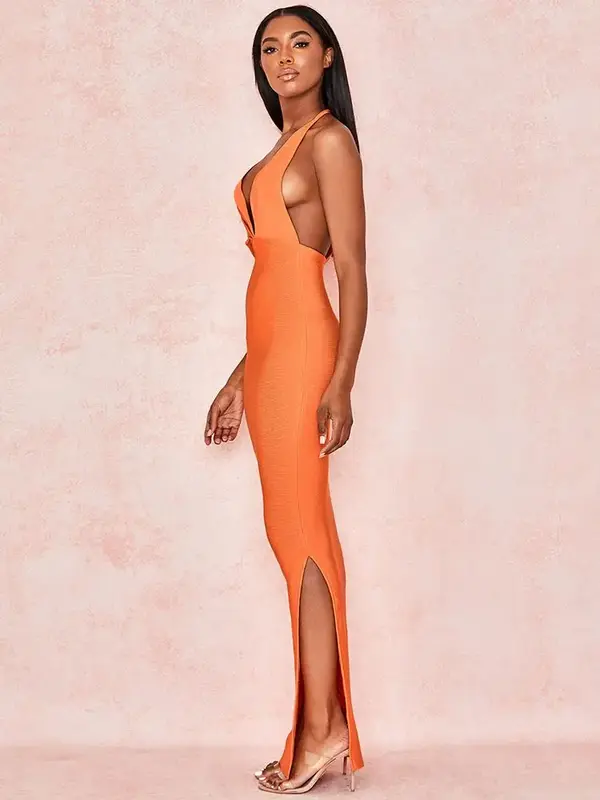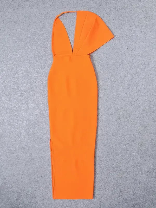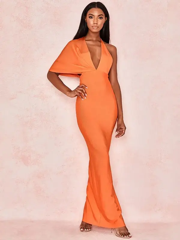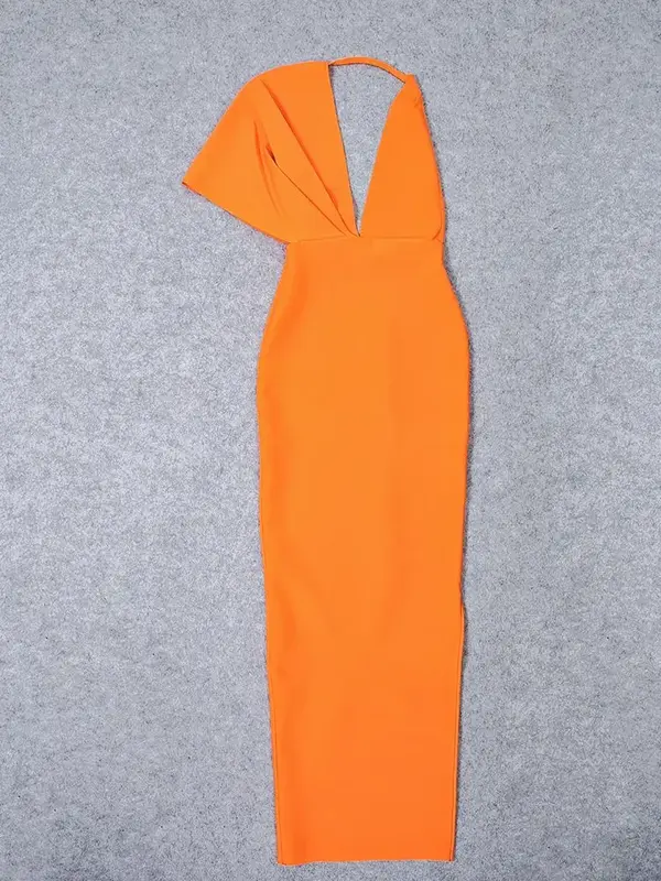 Préparez-vous à captiver tous les regards dans cette robe longue cocktail. Avec son orange éclatant, c’est une véritable déclaration de style. Coupe asymétrique unique et décolleté en V profond pour un look moderne et sensuel. Tissu bandage gainant pour une silhouette parfaitement sculptée et mise en valeur.