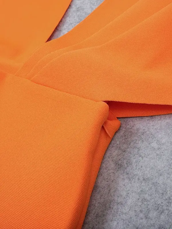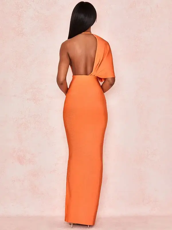 Capturant l’énergie d’un coucher de soleil, cette robe longue orange est une ode à la confiance. Son design asymétrique est spectaculaire : une manche drapée effet cape fait face à une bretelle fine, tandis que le décolleté V plongeant et le dos nu ajoutent une touche de sensualité maîtrisée. Le tissu bandage signature sculpte une silhouette de sirène, moulante jusqu’aux genoux puis délicatement évasée.