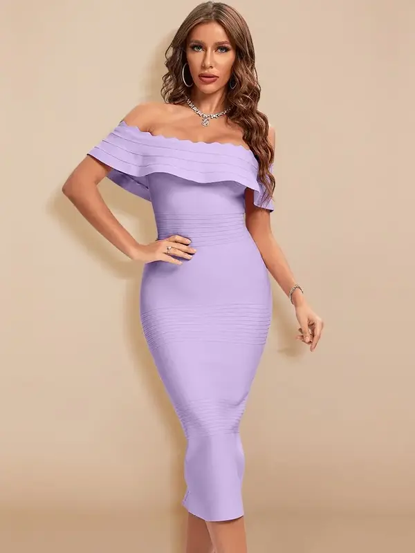 Une teinte lavande tendre, comme une fleur au printemps. Son magnifique col Bardot dénude les épaules avec grâce, souligné par une cascade de volants au bord festonné. Le tissu bandage signature, avec sa texture côtelée, sculpte une silhouette de rêve. C’est l’alliance parfaite entre un design romantique et une couleur pleine de poésie.