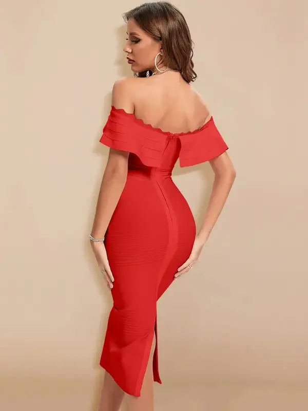 Préparez-vous à captiver tous les regards lors de votre prochain cocktail, soirée ou événement spécial. Cette pièce d’exception est conçue pour sublimer votre silhouette. Sculpte et sublime votre silhouette grâce à son tissu bandage élastique. Design élégant avec col Bardot et volant.