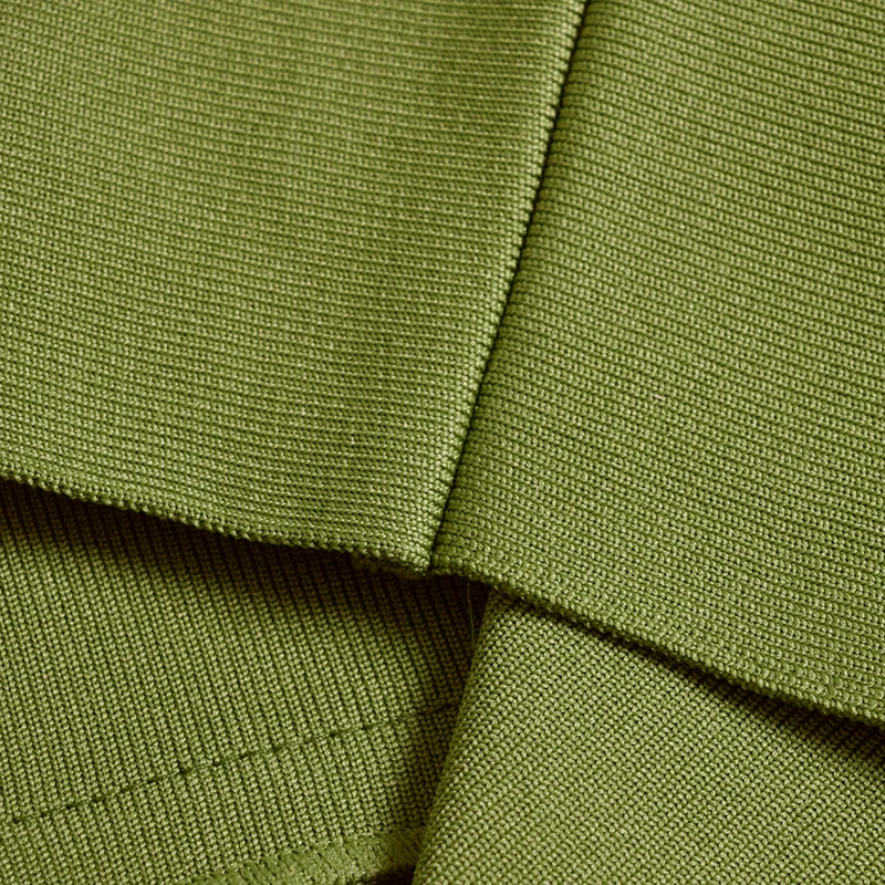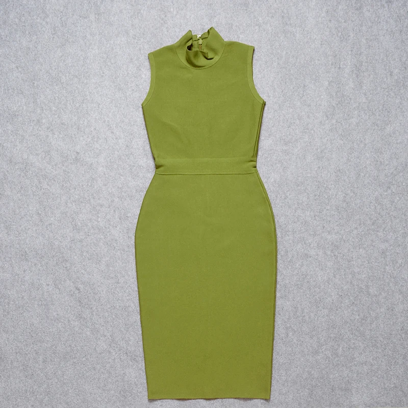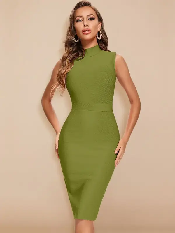 Un vert kaki profond et audacieux, pour un look qui sort de l’ordinaire. Cette robe bandage midi est une véritable pièce de caractère. Sa coupe sans manches et son col montant créent une silhouette incroyablement longiligne et puissante. Le buste est subtilement rehaussé d’un panneau de tissu texturé, un détail raffiné. Confectionnée dans notre tissu bandage extensible, elle sculpte vos courbes avec une autorité discrète, pour un confort et un maintien parfaits.