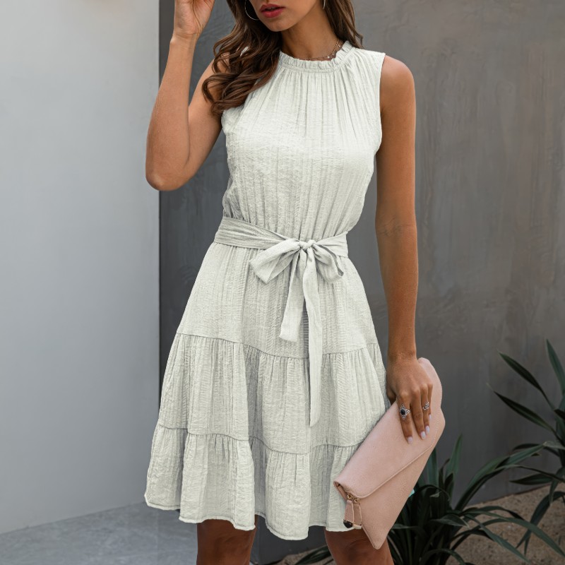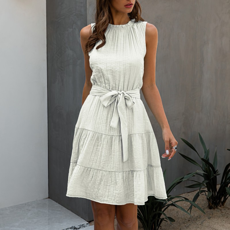 Cette robe est une composition délicate de coton et de polyester, combinant le confort et la douceur du coton avec la fluidité et le drapé exquis de la rayonne. Sa coupe légèrement ample épouse parfaitement toutes les silhouettes pour un rendu flatteur. Le design uni de la robe met en avant la couleur blanche immaculée, évoquant une sensation de fraîcheur et de pureté. Dotée d’un col rond, cette robe sans manches respire la féminité tout en gardant une allure décontractée. C’est une pièce parfaite pour créer un ensemble harmonieux avec vos accessoires préférés. Vous tomberez sans doute amoureuse de sa simplicité sophistiquée et de son confort inégalé.