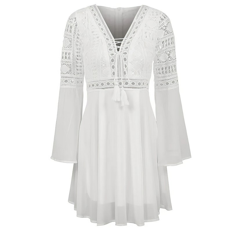 Découvrez « Clémence », une robe bohème chic courte qui incarne la liberté et la légèreté. Son blanc immaculé et sa dentelle raffinée en font la tenue idéale pour une escapade estivale ou une occasion spéciale.