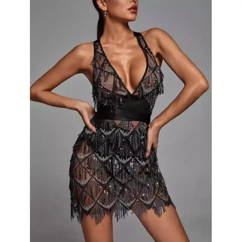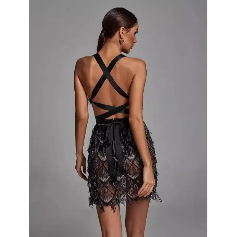 Prête à devenir le centre de l’attention ? Cette robe de soirée courte noire est bien plus qu’une tenue, c’est une déclaration audacieuse pour celles qui veulent briller. Conçue pour captiver la lumière et les regards, elle s’anime à chaque mouvement grâce à ses cascades de franges perlées et ses paillettes scintillantes qui créent un effet hypnotique et résolument glamour. Sa coupe mini et ajustée met en valeur un décolleté plongeant spectaculaire, mais le véritable secret de son allure réside dans son dos nu vertigineux, structuré par un laçage graphique qui sublime la silhouette. Parfaitement équilibrée entre séduction et sophistication, c’est la robe de cocktail idéale, la tenue de fête ultime pour le Nouvel An ou pour toute occasion où votre seul objectif est de vous sentir puissante et absolument inoubliable.