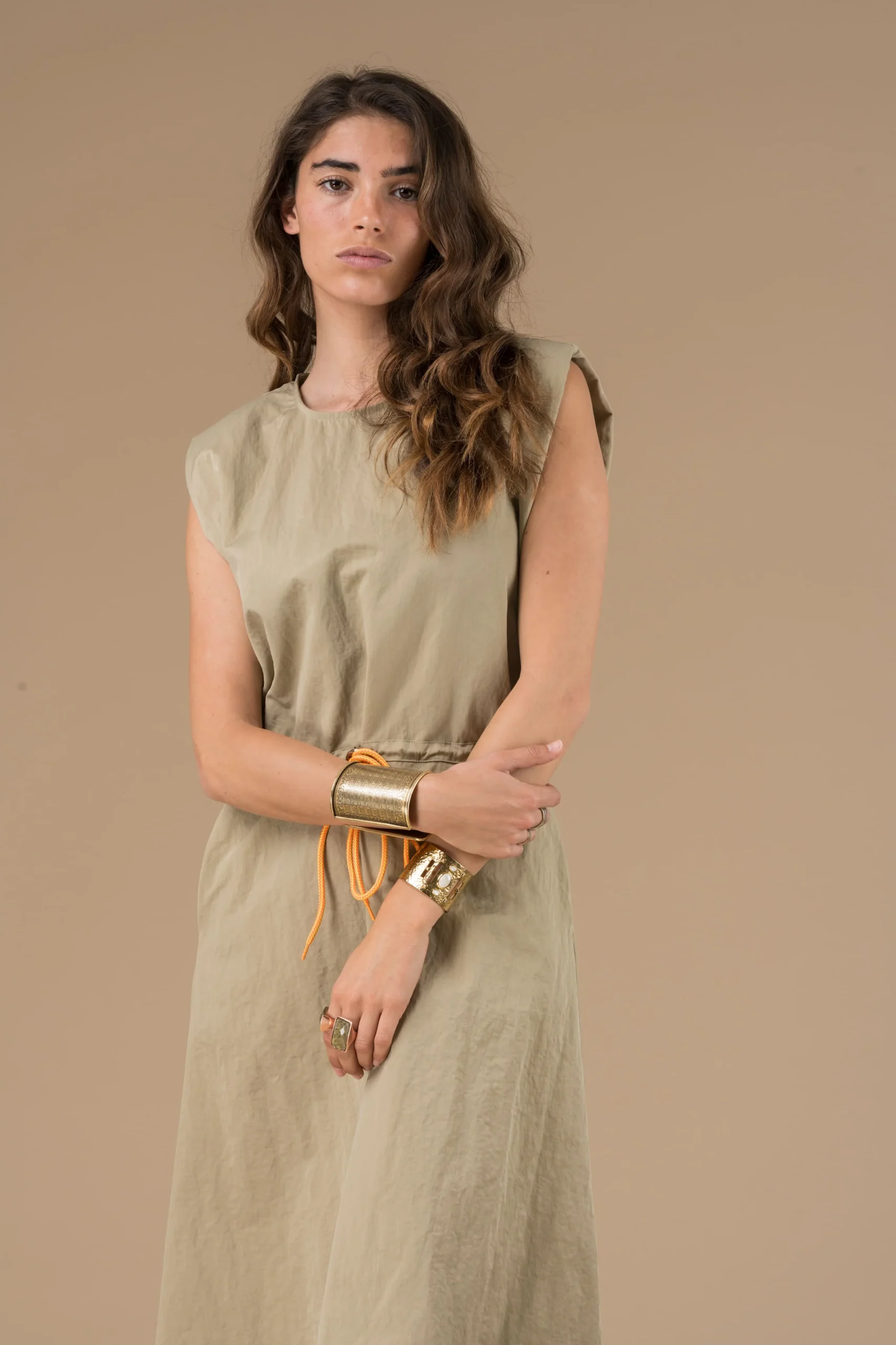 Robe Margareth Beige longue sans manches, à large emmanchure et col rond, ceinturée par une cordelette de couleur bronze. La robe se ferme par une fermeture éclair dans le haut du dos. Elle comporte une étiquette brodée Adoré Paris sur le côté.