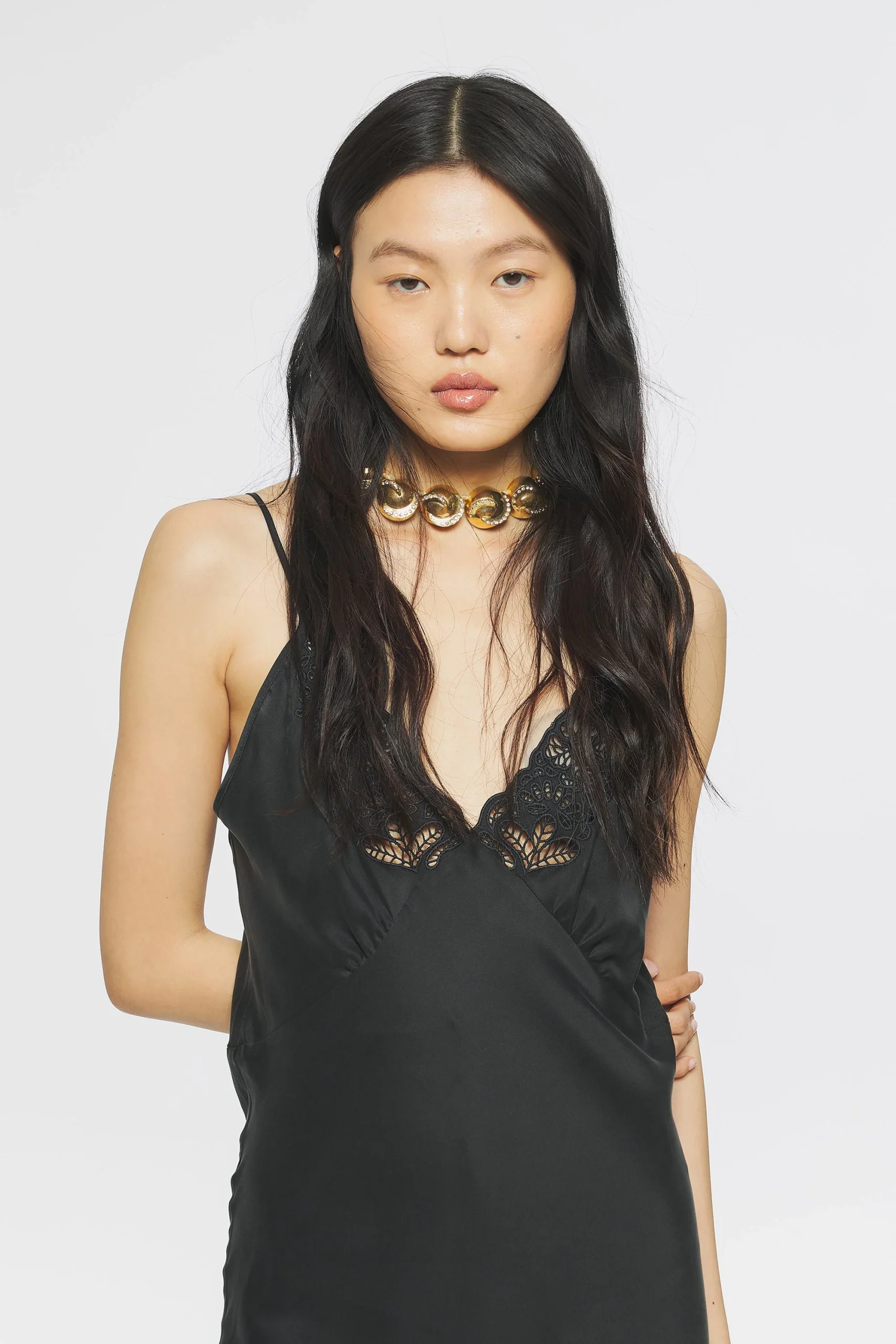 Robe en tencel. Broderies sur le devant ajourées et faites artisanalement. Robe longue à bretelles.