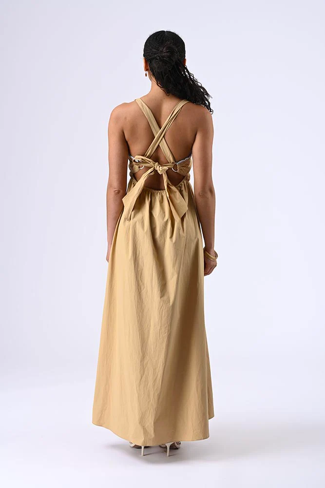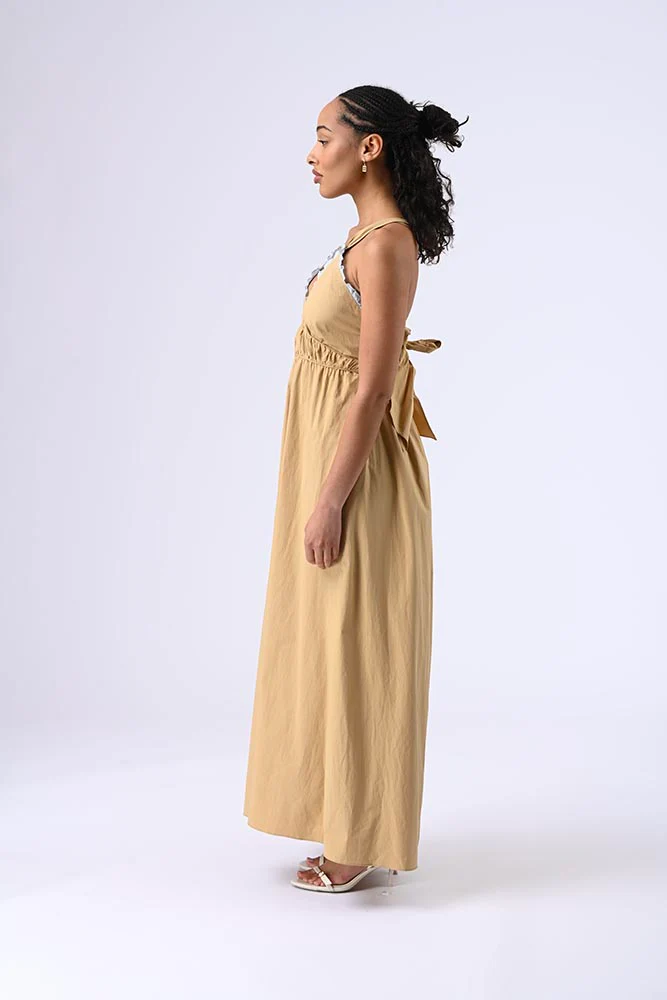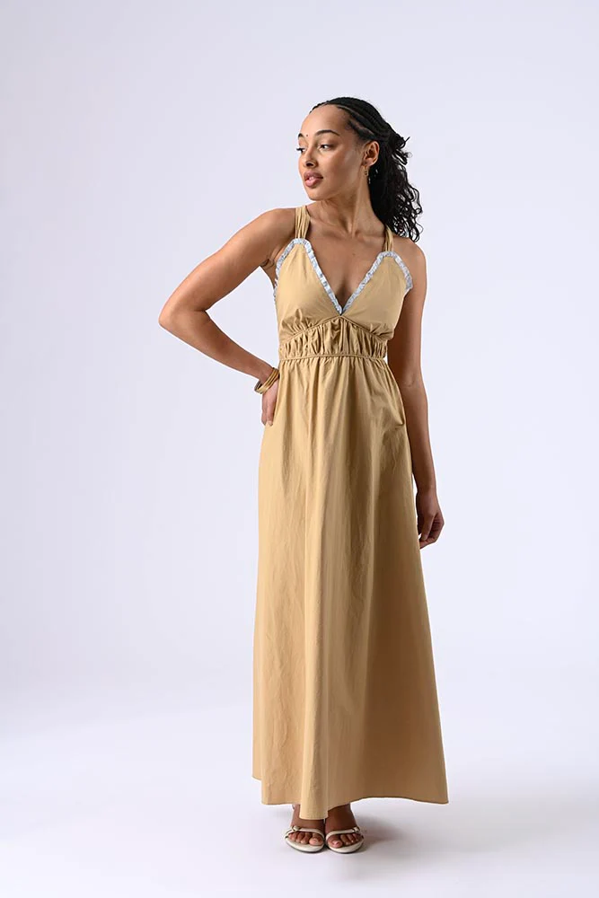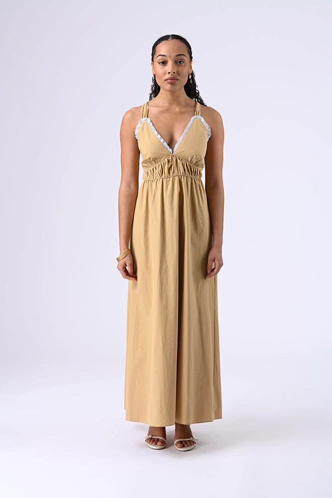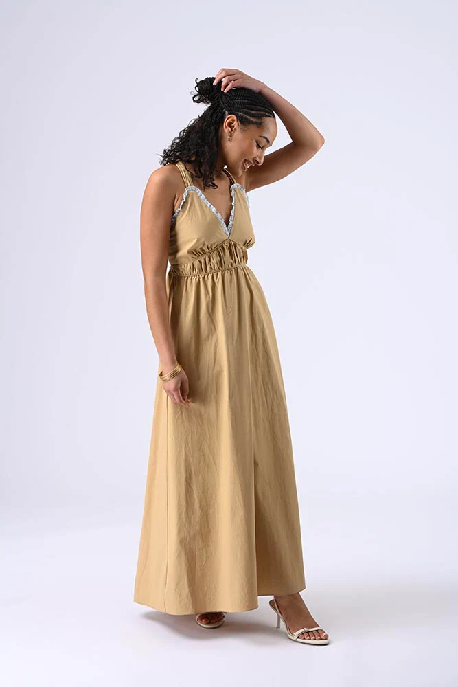 Robe longue, élégante et fluide, avec un décolleté V bordé de volants, dos croisé raffiné et taille cintrée pour une silhouette sublimée. Couleur écru