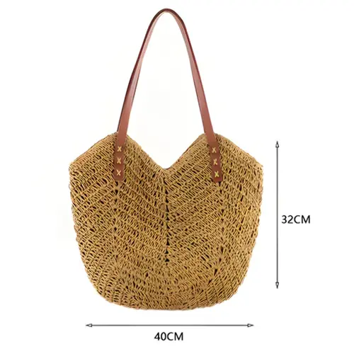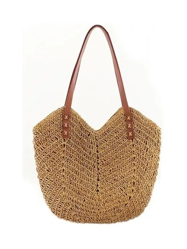Les longues anses en similicuir marron, renforcées par des coutures croisées, offrent une touche raffinée et garantissent un port confortable à l’épaule. Spacieux et léger, ce sac est idéal pour transporter vos essentiels avec style, que ce soit pour une journée en ville, une escapade ou une sortie à la plage.