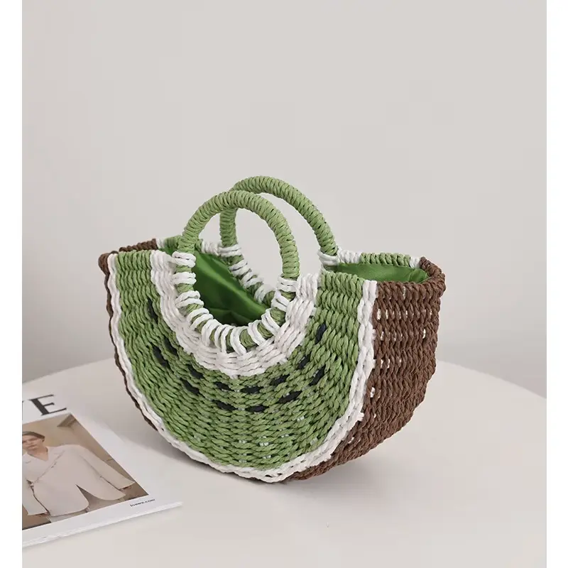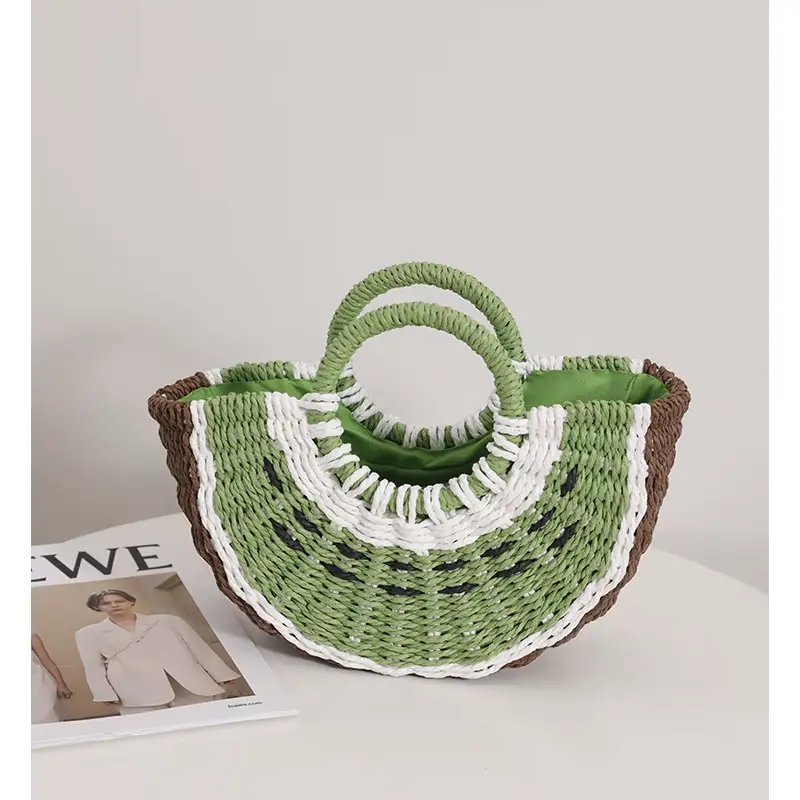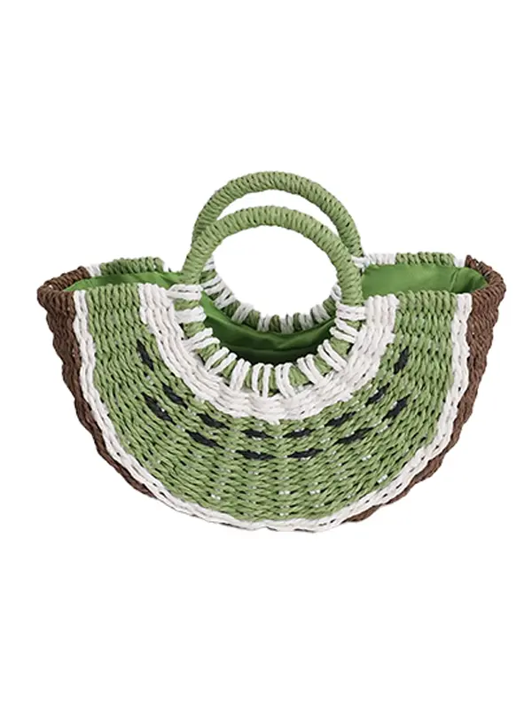 - Design estival et original : Ce sac en paille tissée adopte une forme demi-lune ornée de motifs rappelant une kiwi, pour un style à la fois fun et tendance.