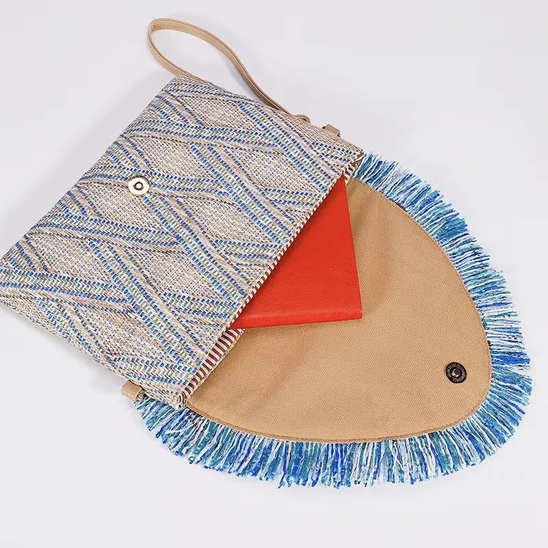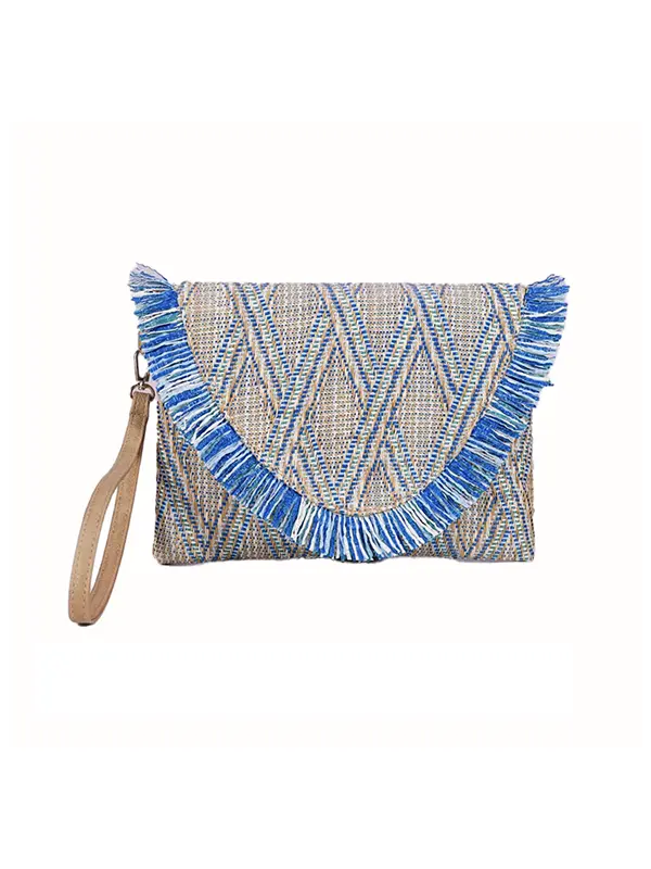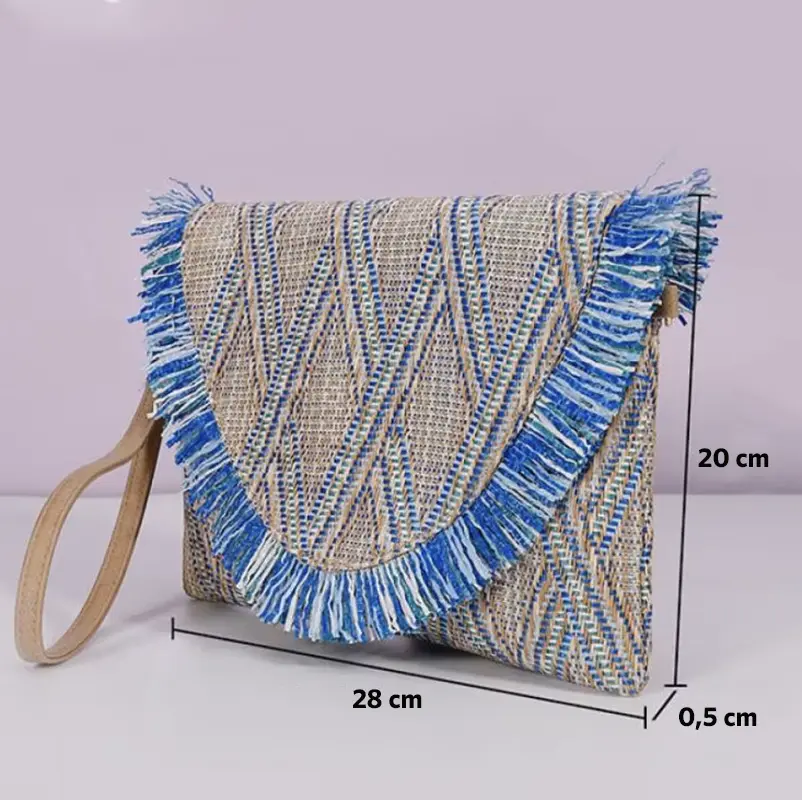 Apportez une touche bohème et élégante à votre tenue avec ce magnifique sac pochette bohème chic Mira. Confectionnée en paille tressée avec des motifs géométriques raffinés, elle se distingue par son rabat enveloppe orné de franges bleues vibrantes qui ajoutent une note audacieuse et estivale.