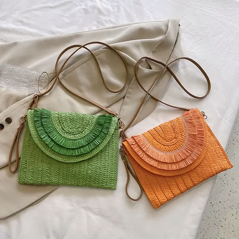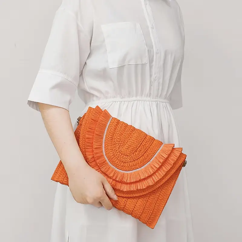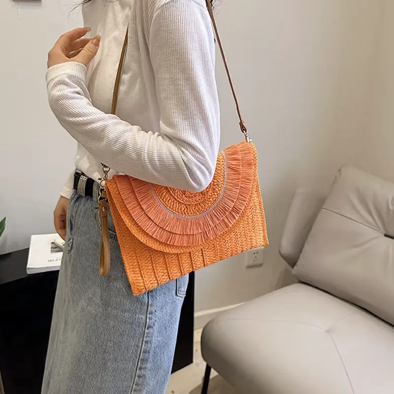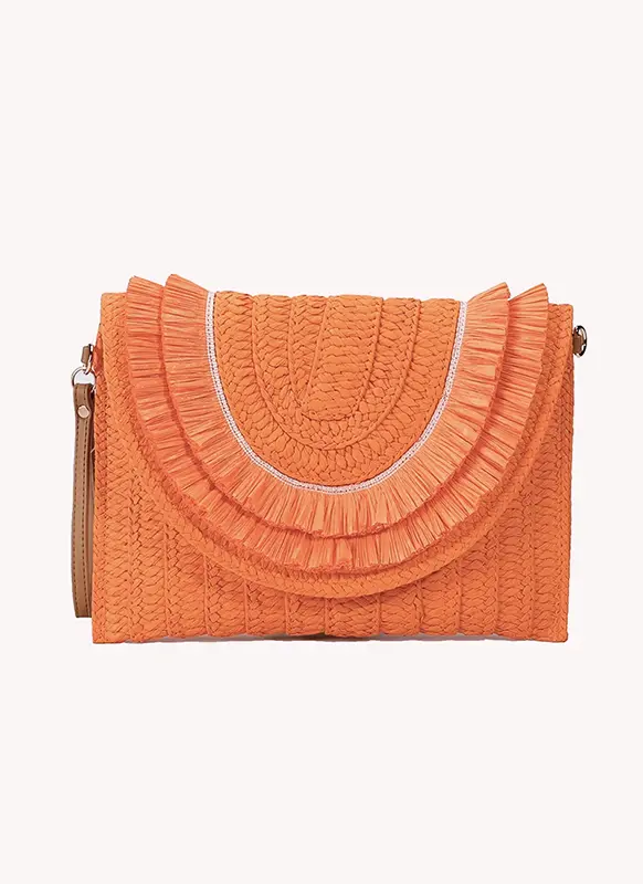 Cet été, adoptez le style bohème en portant notre sac pochette paille franges bohème orange. Son rabat orné de franges élégantes et son coloris apportent une note fraîche et estivale à votre tenue. Ce petit sac paille est fabriqué artisanalement avec du rotin naturel.
