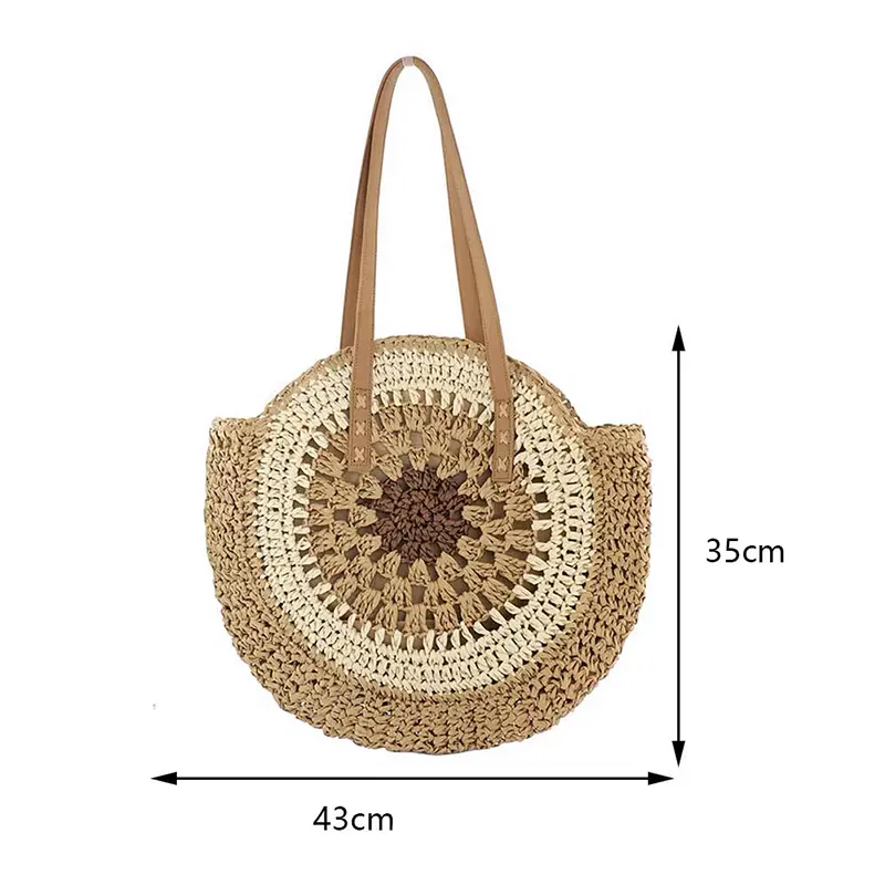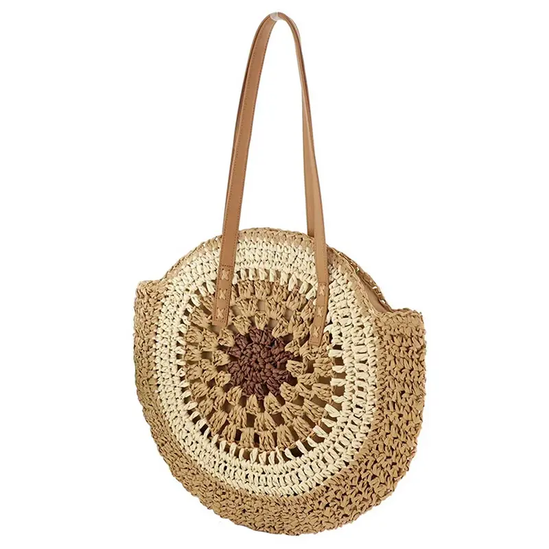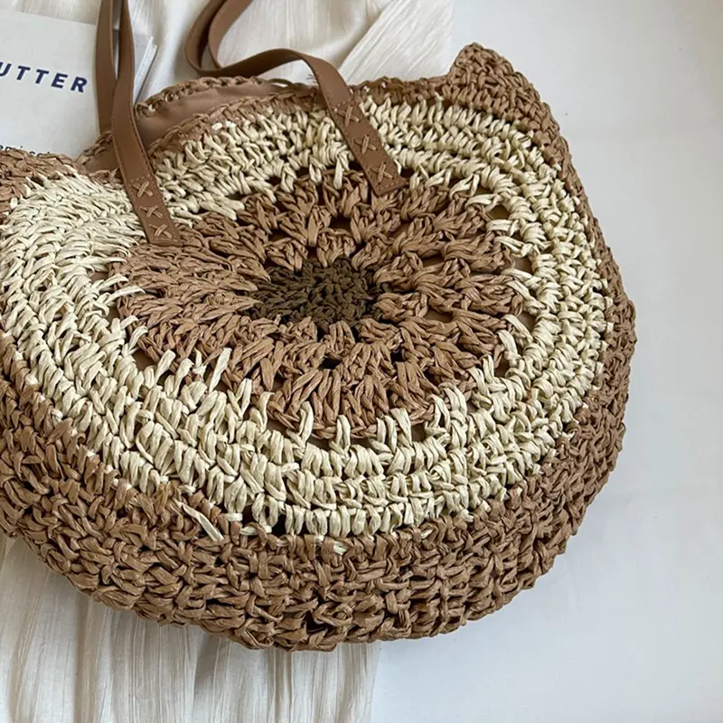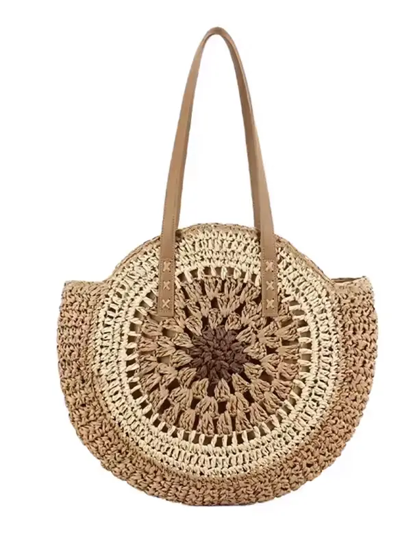 Sac Rond Paille Bohème Tissé avec Fermeture – Marron