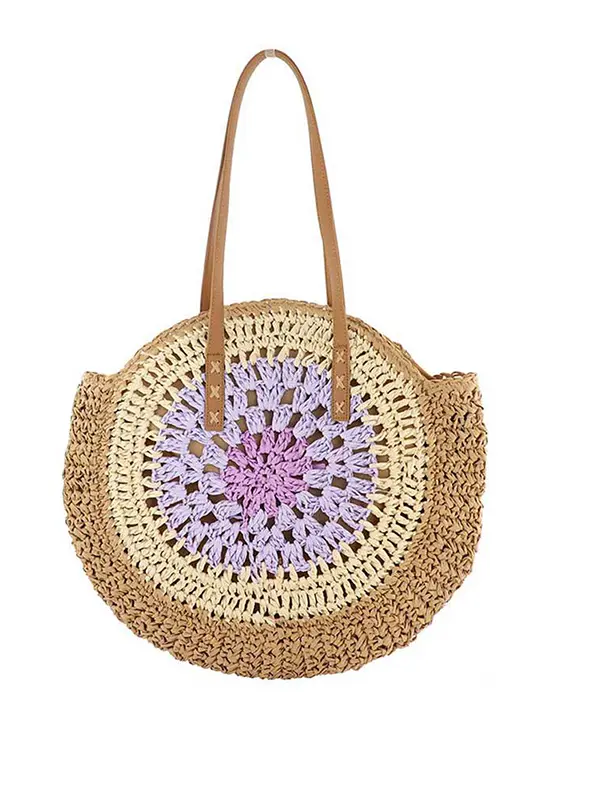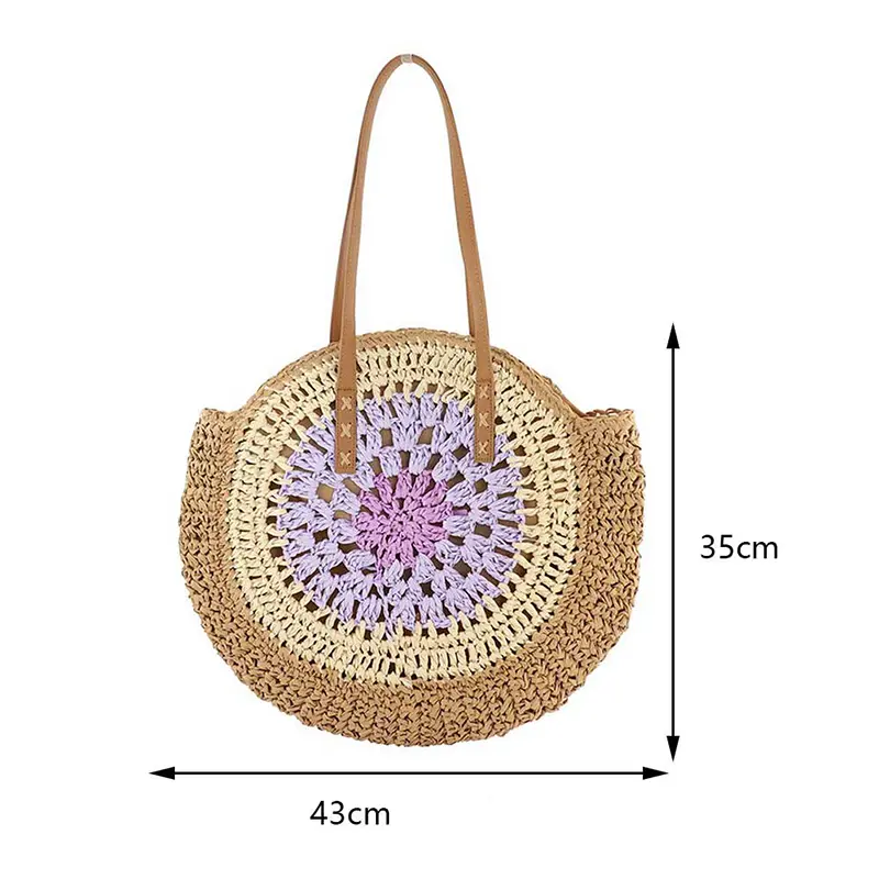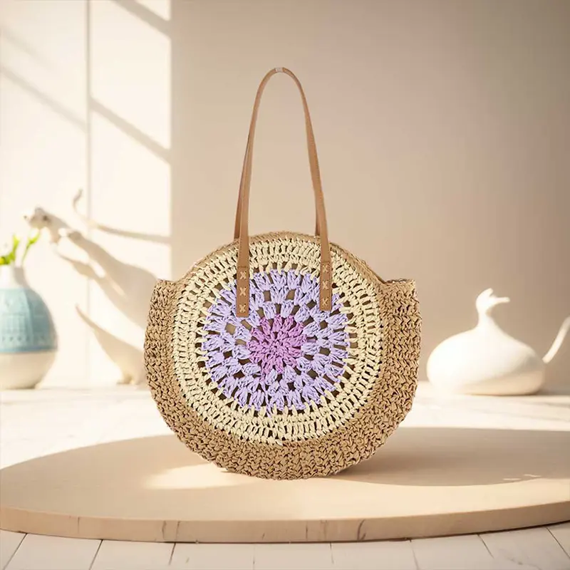Sac Rond Paille Bohème Tissé avec Fermeture – Violet
