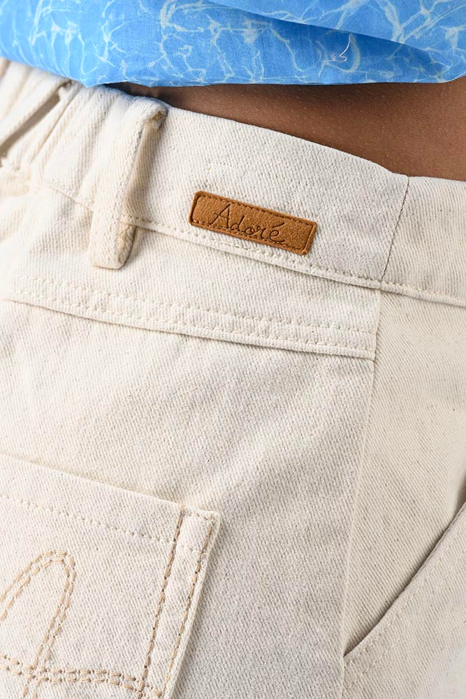 Short en jean, taille haute, petit bouton, élastique au dos, poches pratique et surpiqûres colorées. Couleur écru