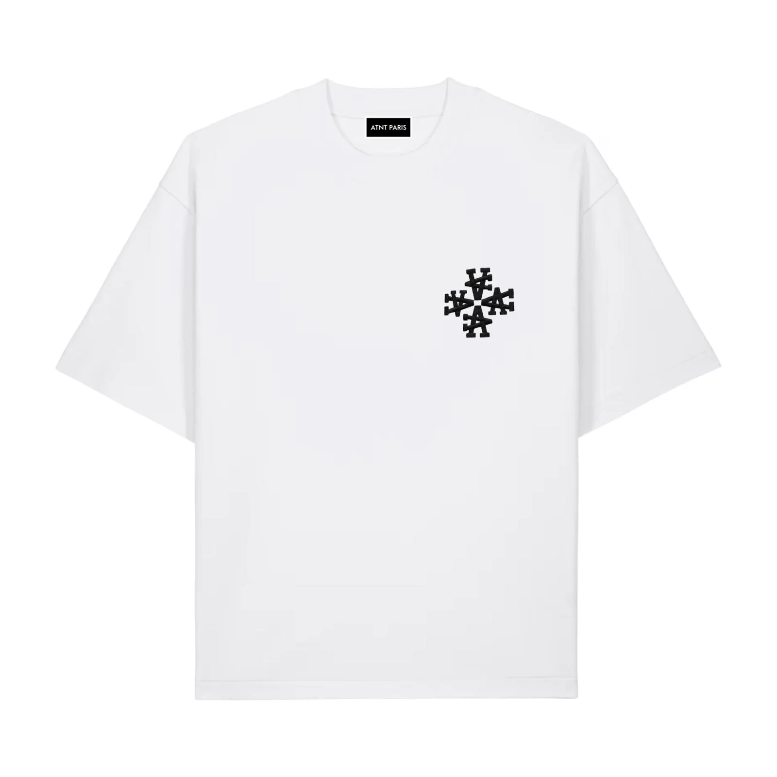 Le T-shirt Signature Blanc d’ATNT Paris incarne l’essence du streetwear de luxe. Confectionné en coton biologique premium 280g/m², il se distingue par sa coupe boxy oversize, ses épaules tombantes, et son logo brodé noir sur la poitrine.