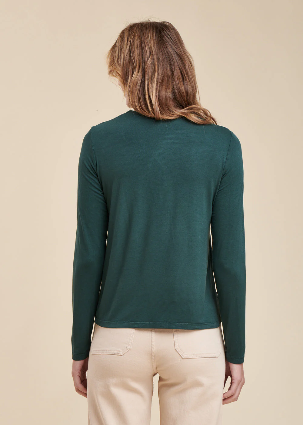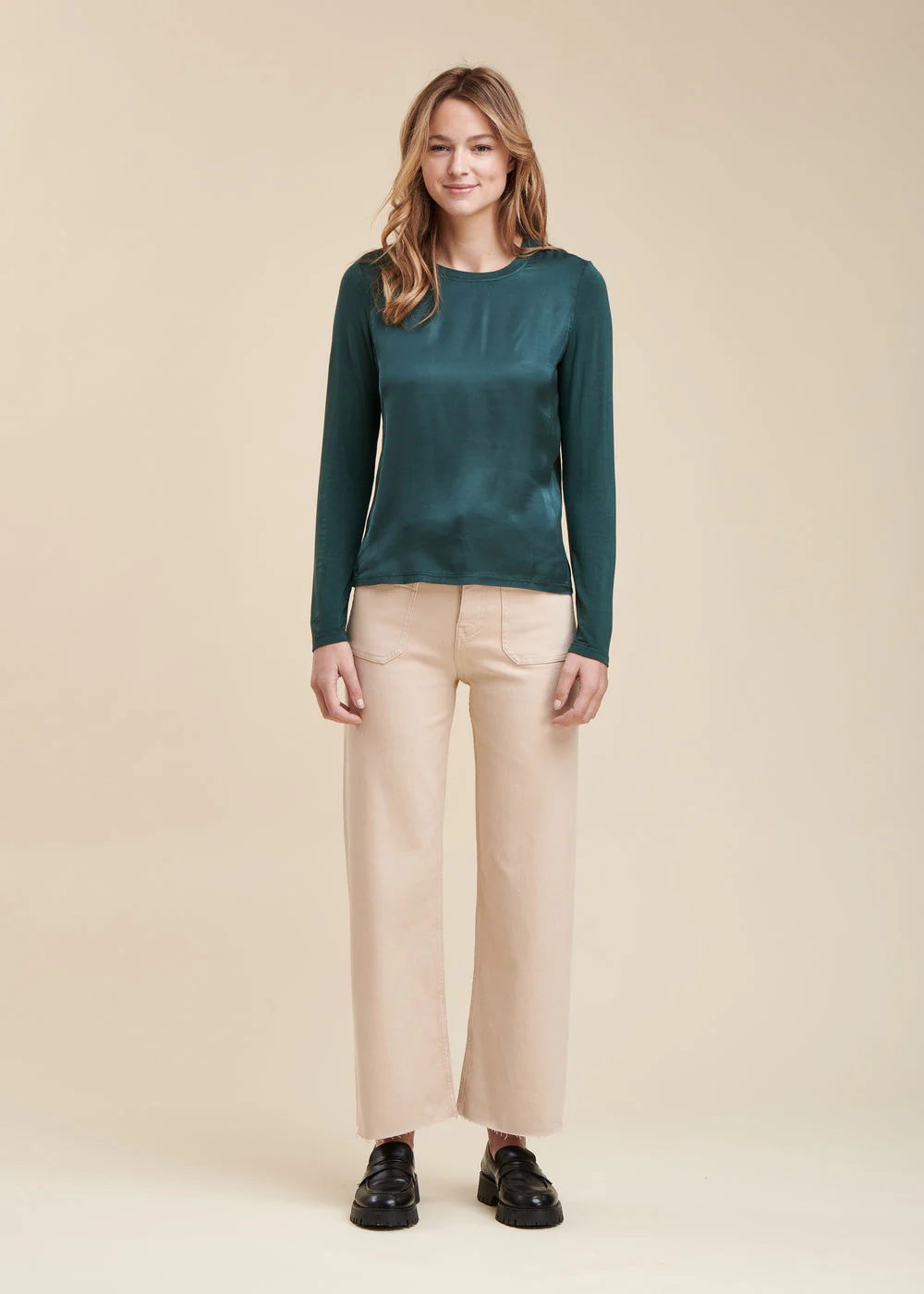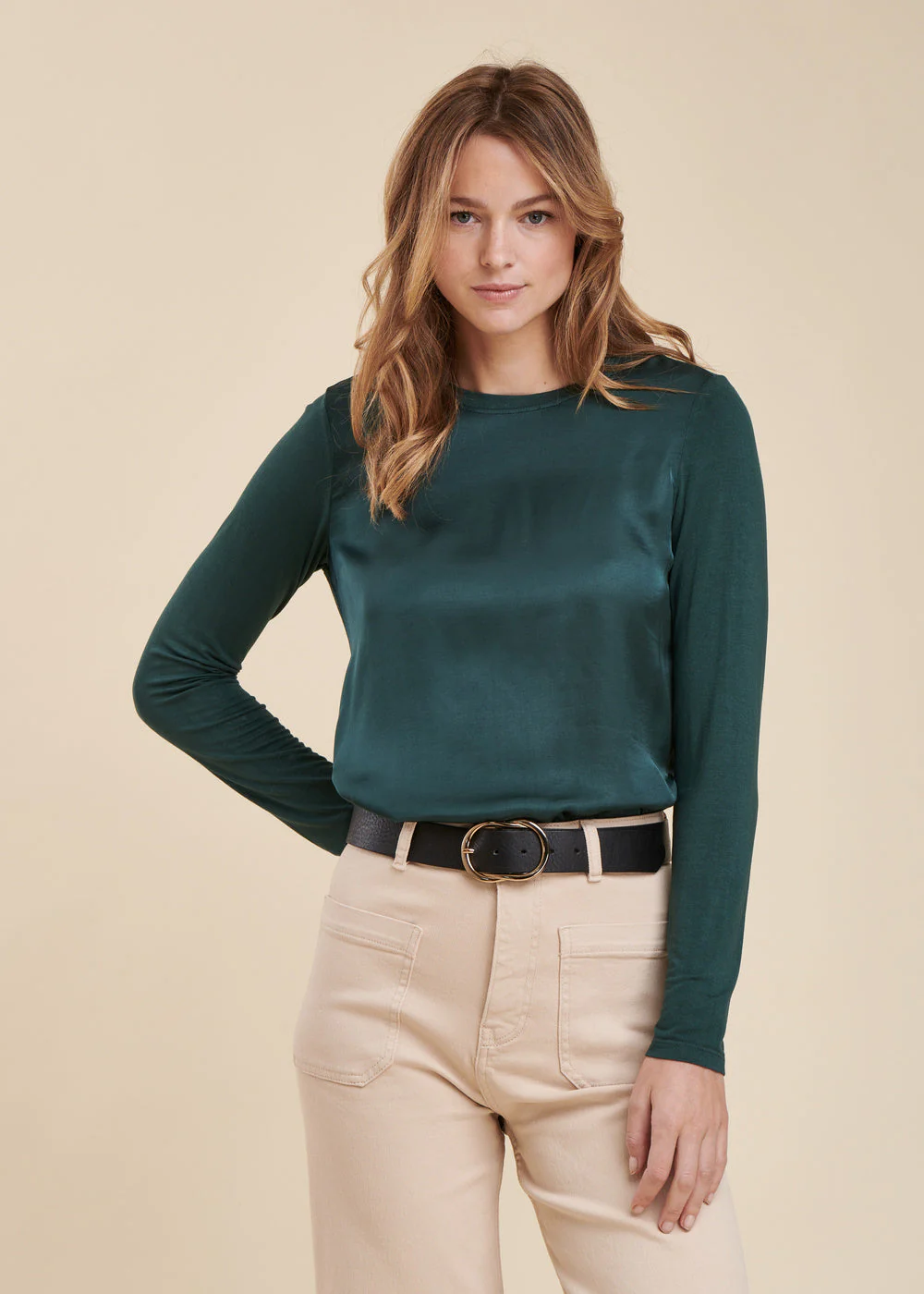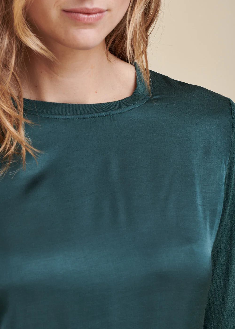 Tee-shirt bi-matière, dos et manches en jersey, le devant est en tissu légèrement brillant ton sur-ton.