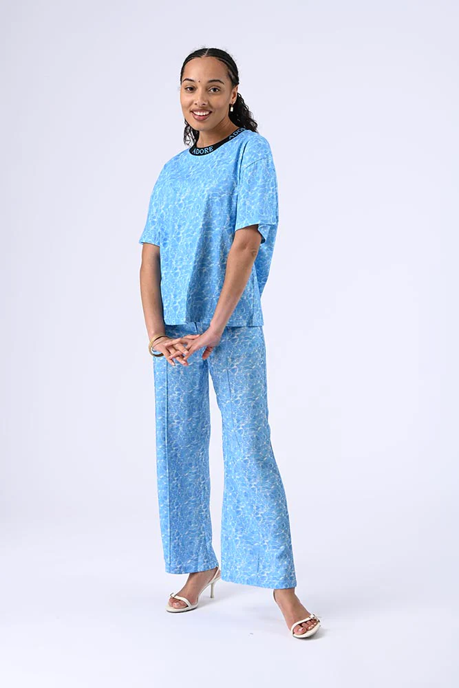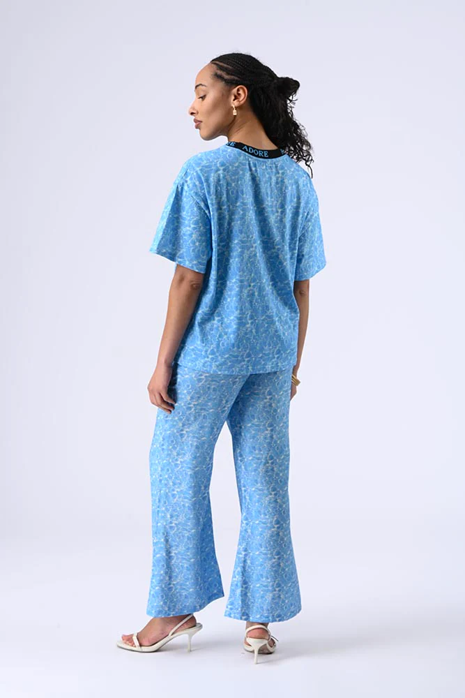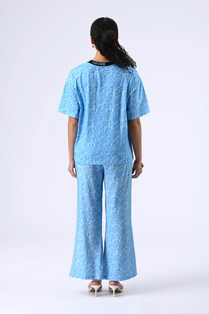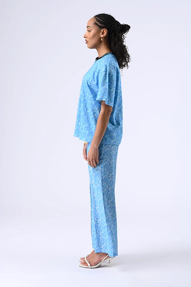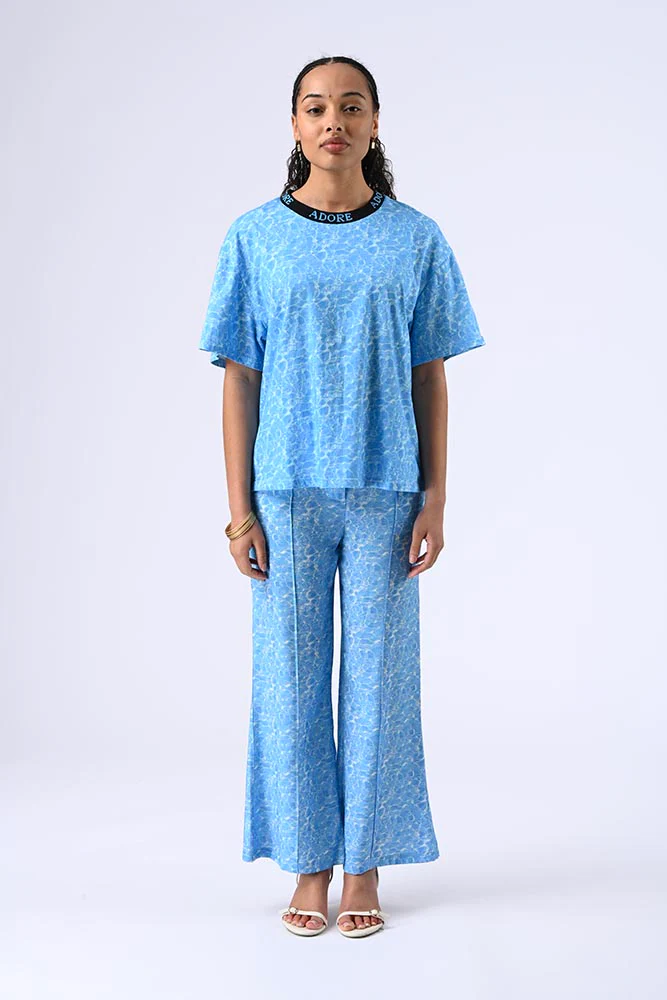 Son col rond contrasté et ses manches courtes en font une pièce intemporelle, tandis que l’imprimé et la broderie élégante sur le devant ajoutent une touche sophistiquée. La couleur bleu clair, rehaussée d’un effet marbré ou texturé, apporte une originalité discrète mais remarquée.