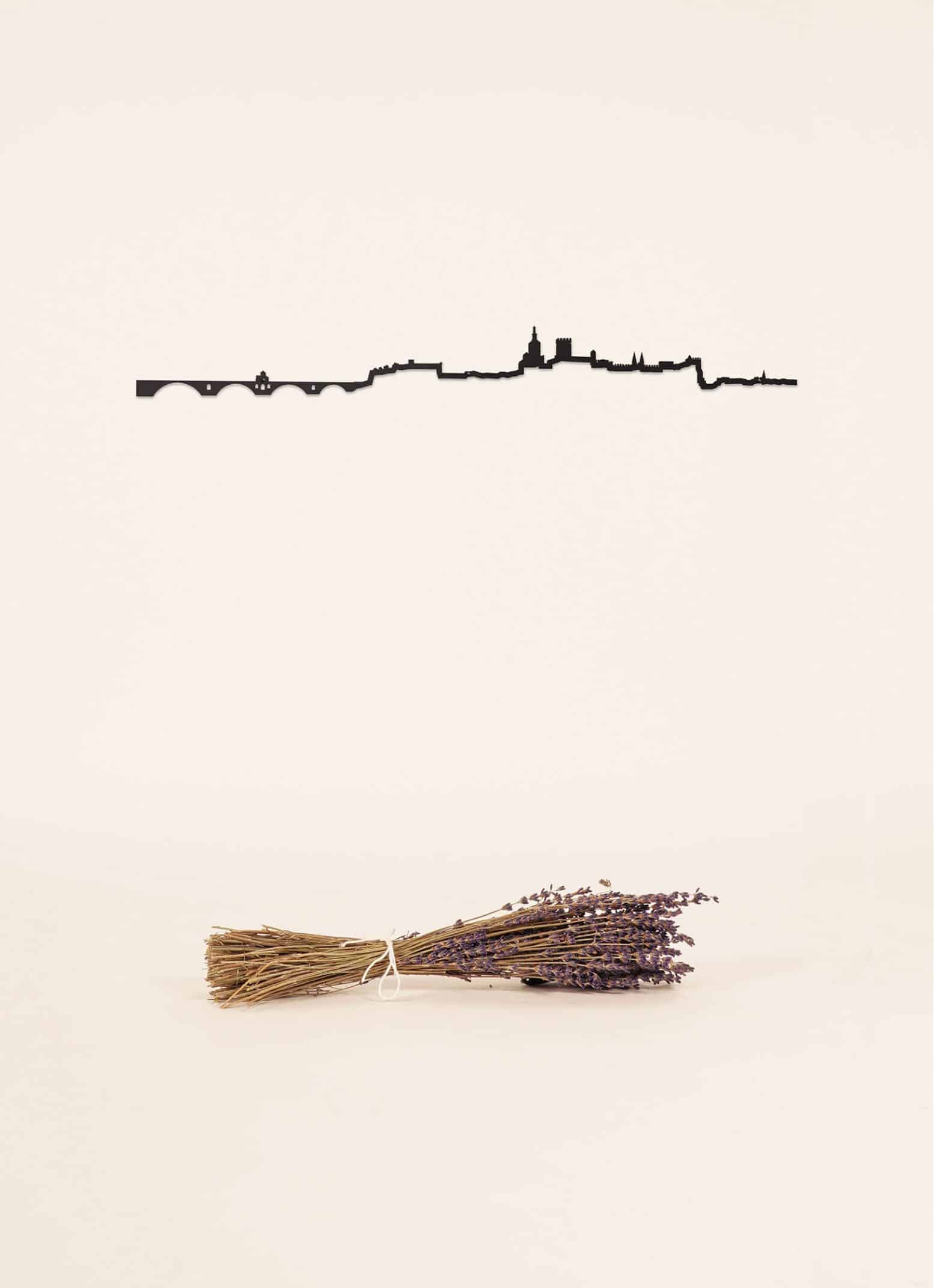 La silhouette d’Avignon depuis l’île de la Barthelasse. On y voit le Palais des Papes, la basilique Notre Dame des Doms et le Pont d’Avignon. Ligne en acier de 1,5 mm d’épaisseur, à fixer au mur avec 3 clous en extérieur comme en intérieur. Tous les produits The Line sont fabriqués en France.