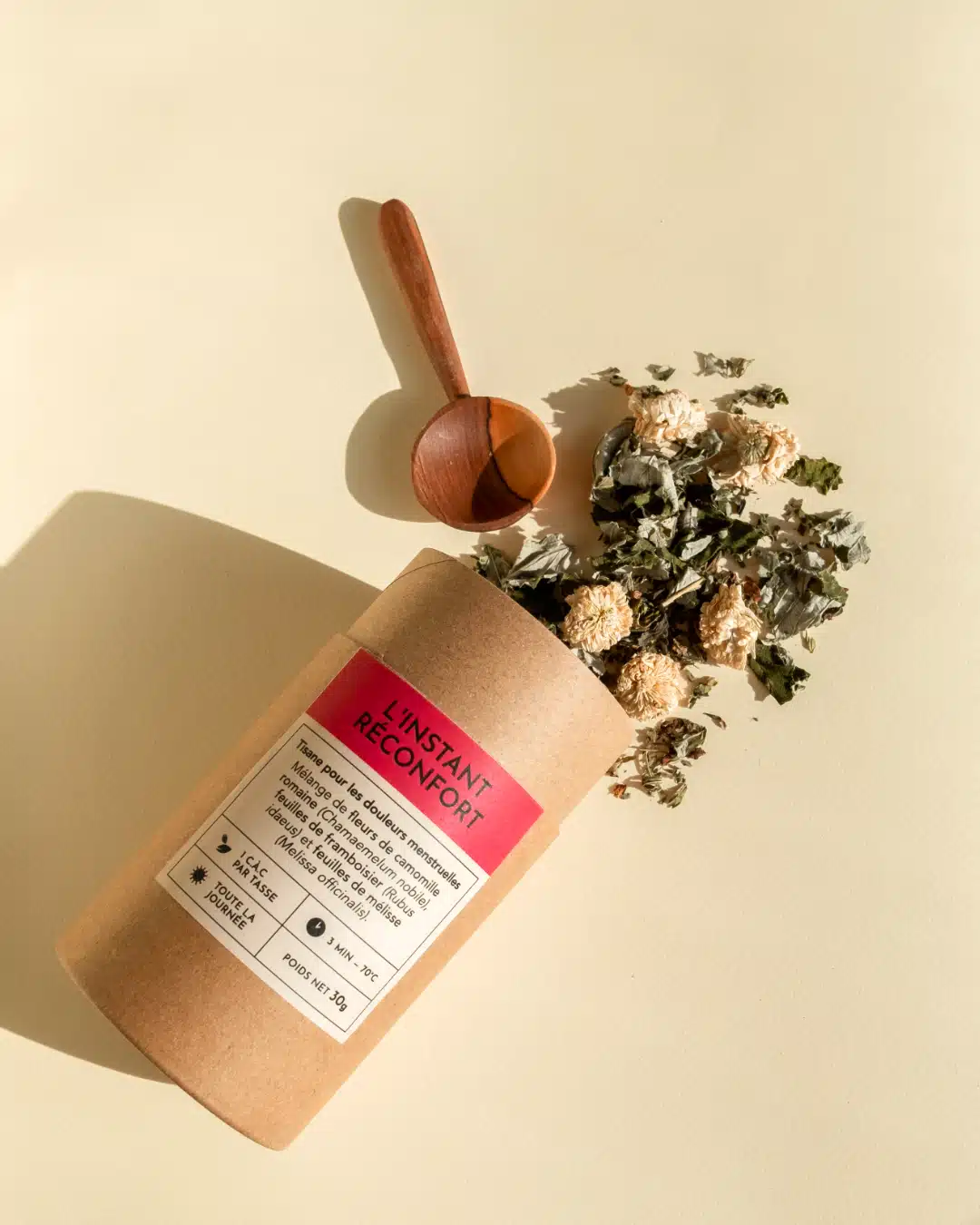 La tisane L’instant réconfort, votre rituel féminin essentiel. Découvrez la tisane L‘instant réconfort, une infusion conçue pour alléger les symptômes prémenstruels, apaiser les crampes et offrir un soutien naturel à l‘endométriose. Formulée minutieusement à partir de la feuille de mélisse, des fleurs de camomille romaine et des feuilles de framboisier, laissez–vous envelopper par les propriétés réconfortantes et apaisantes de cette tisane. Faites de L‘instant réconfort votre allié tout au long de votre cycle féminin, vous offrant un soulagement doux et bien mérité. Créée et assemblée en France dans des ateliers parisiens Recette 100% naturelle et sans arômes ajoutés Plantes entières françaises & bio