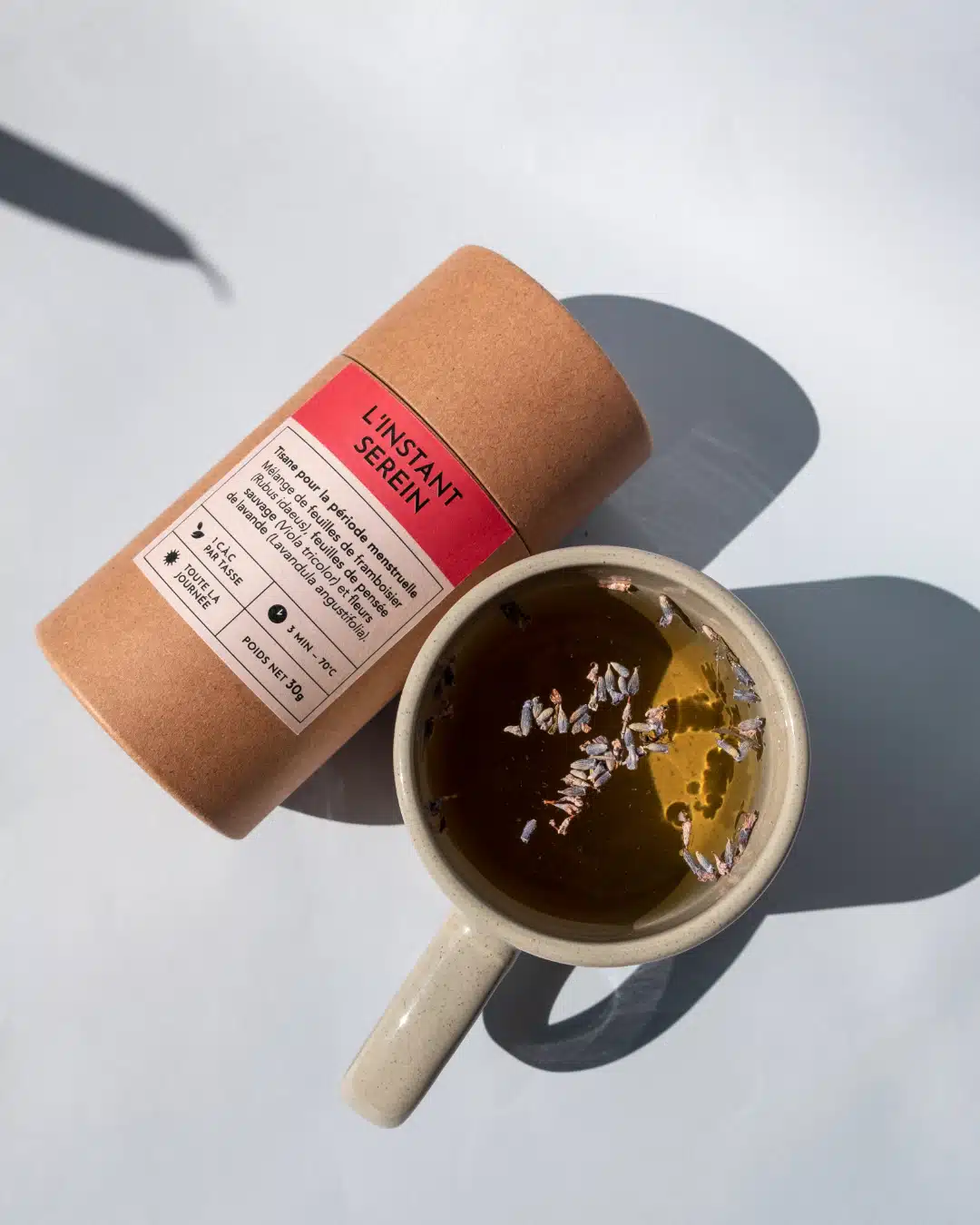 La tisane L’instant serein, votre rituel féminin essentiel. Découvrez L‘instant Serein, imaginé avec soin pour vous accompagner à chaque étape de votre cycle atténuant ainsi naturellement vos douleurs menstruelles et votre acné hormonale. La tisane est créée à partir de la lavande, du framboisier et de la pensée sauvage créant une bulle de douceur et de tranquillité. Faites de chaque tasse un moment de calme et de ressourcement pour un quotidien harmonieux. Créée et assemblée en France dans les ateliers parisiens Recette 100% naturelle et sans arômes ajoutés Plantes entières françaises & bio